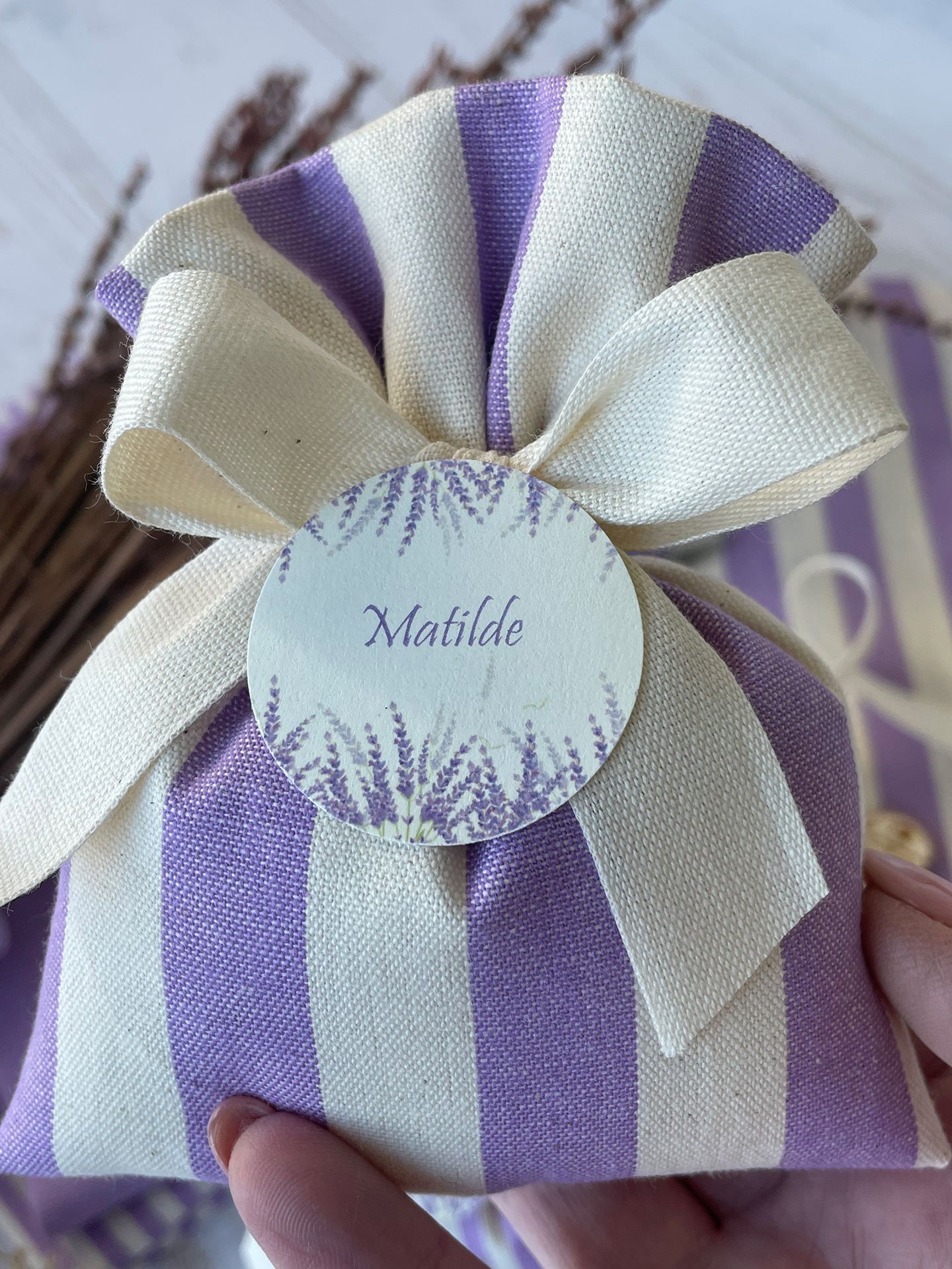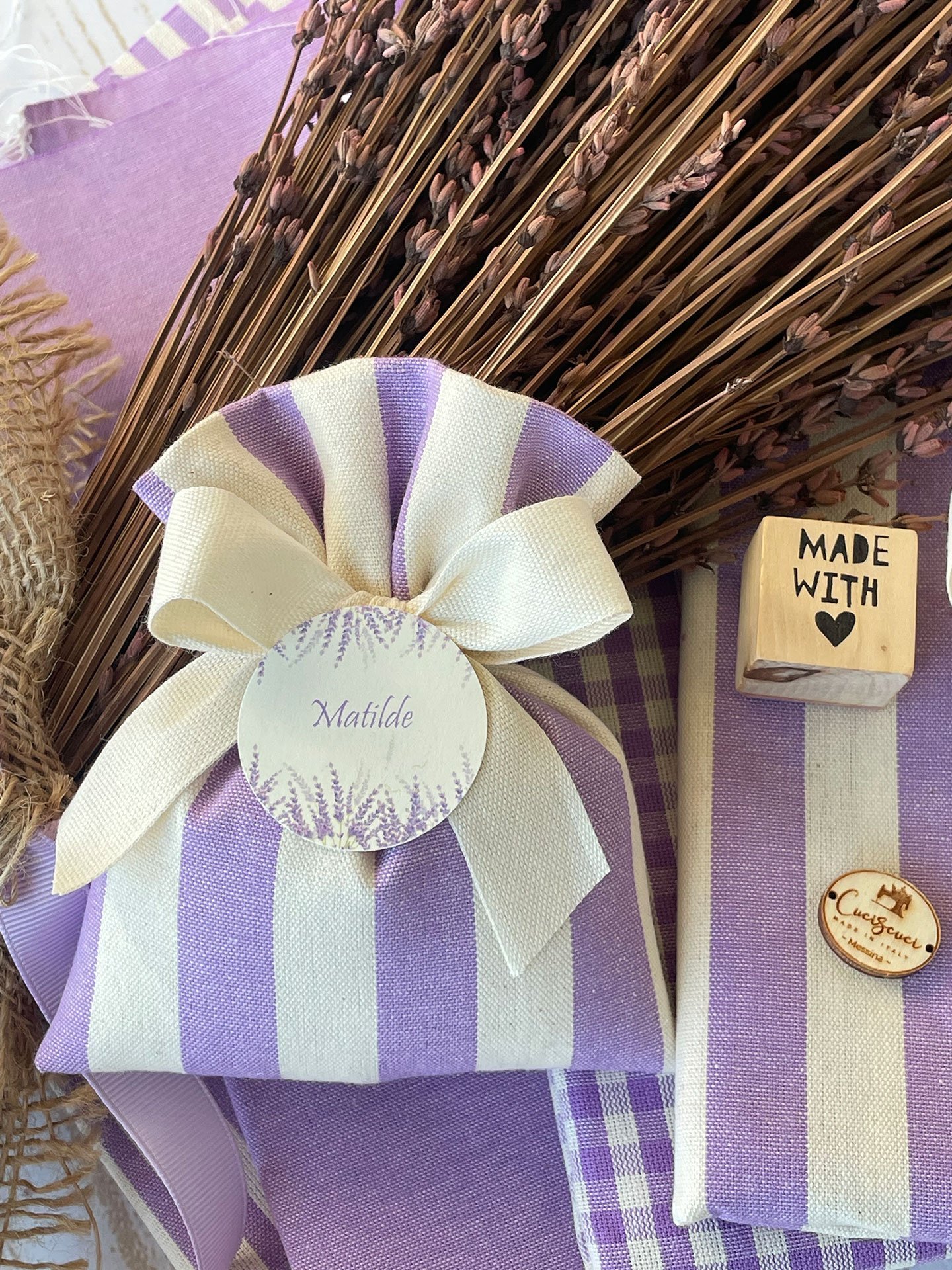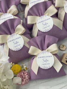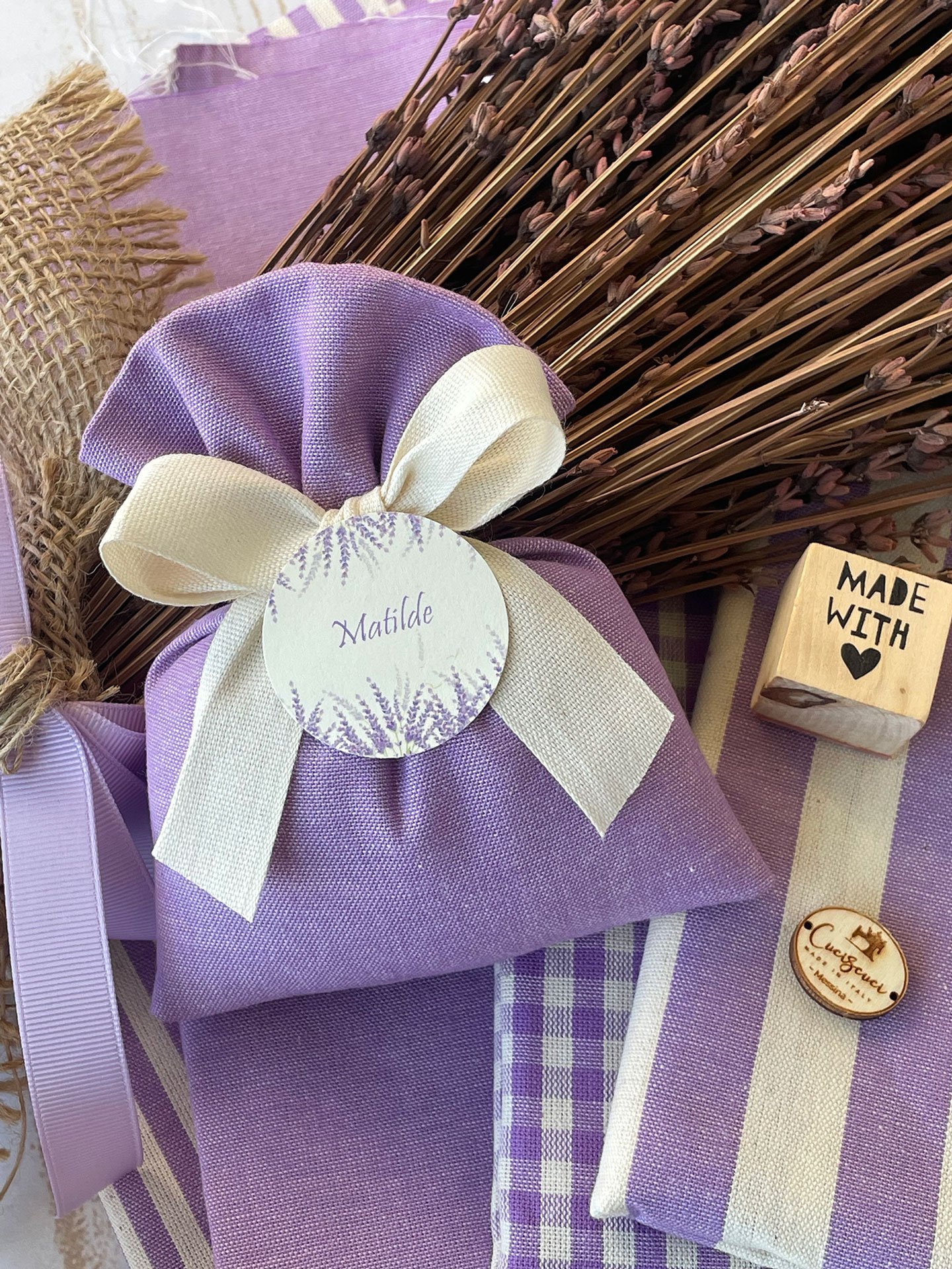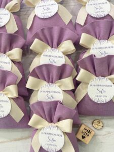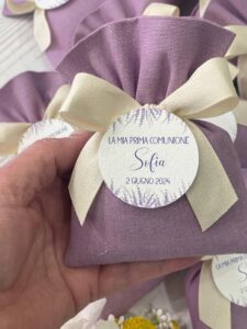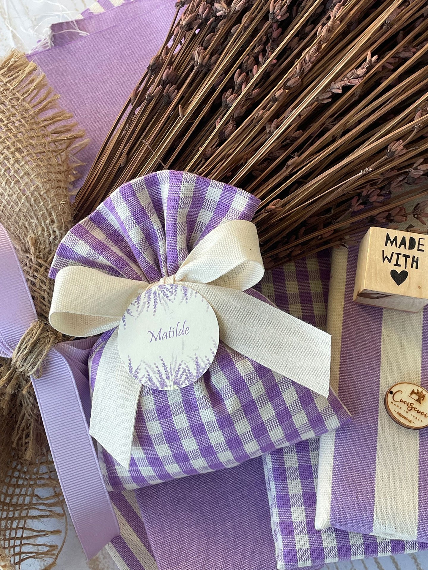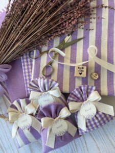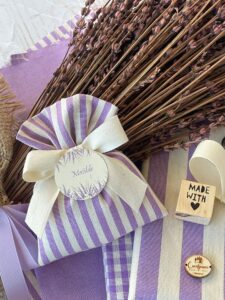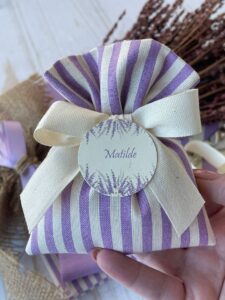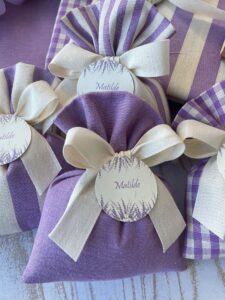 Confezionato in cotone tinto filo in fantasie assortite (o a scelta), nei raffinati toni del lilla, è la bomboniera ideale per celebrare i momenti più importanti.
