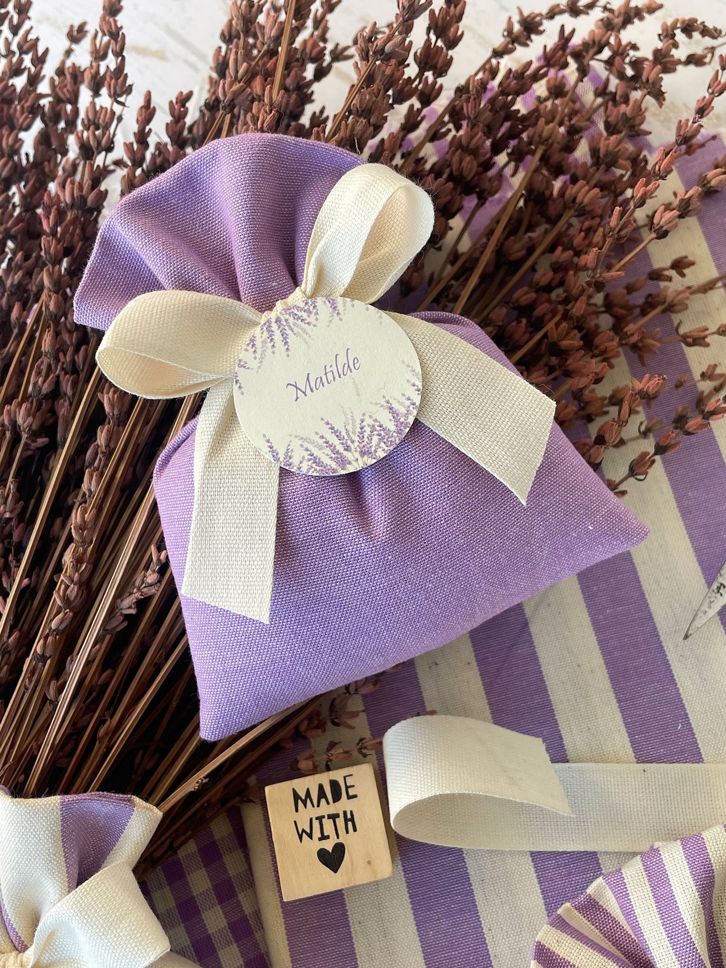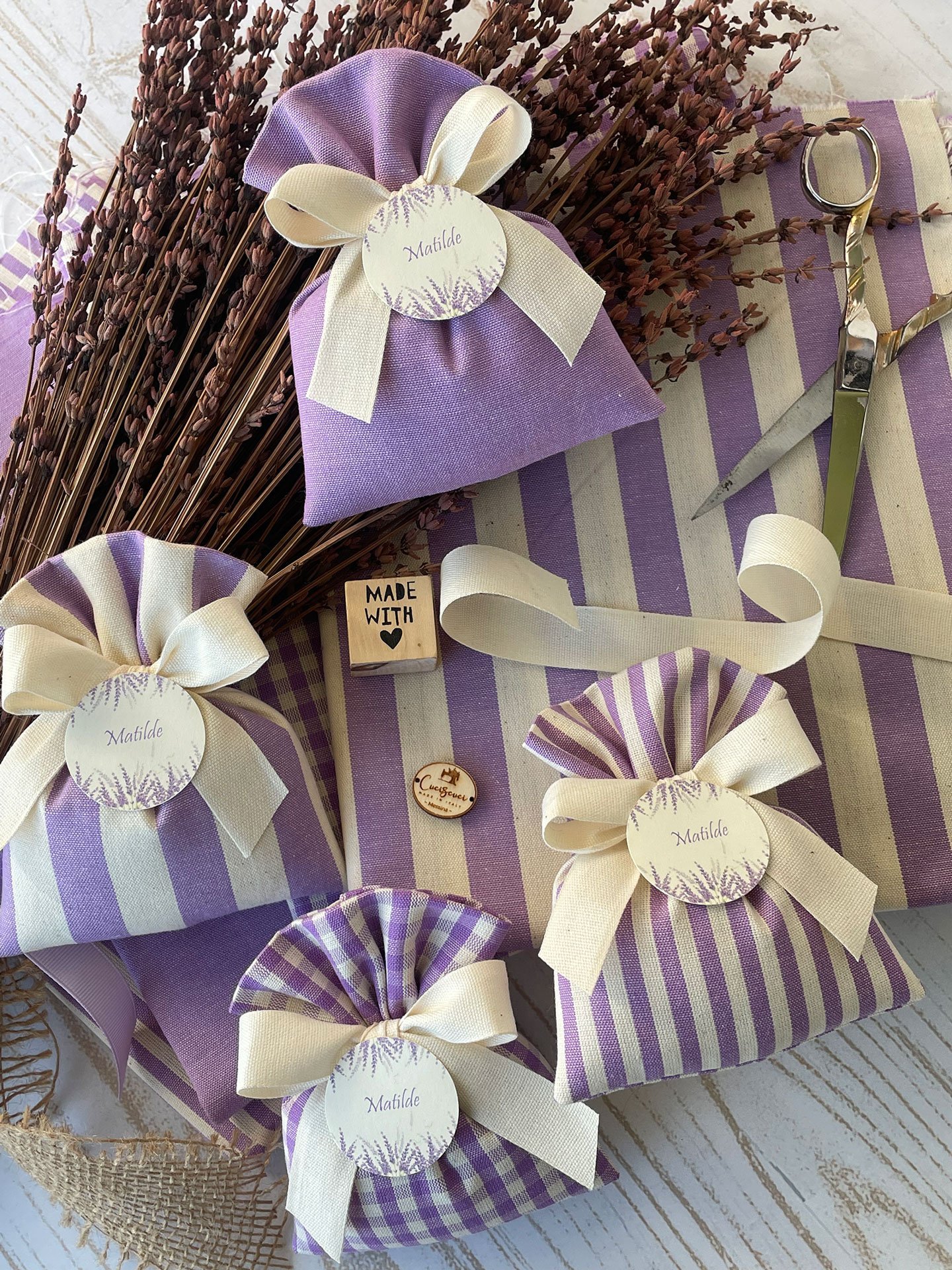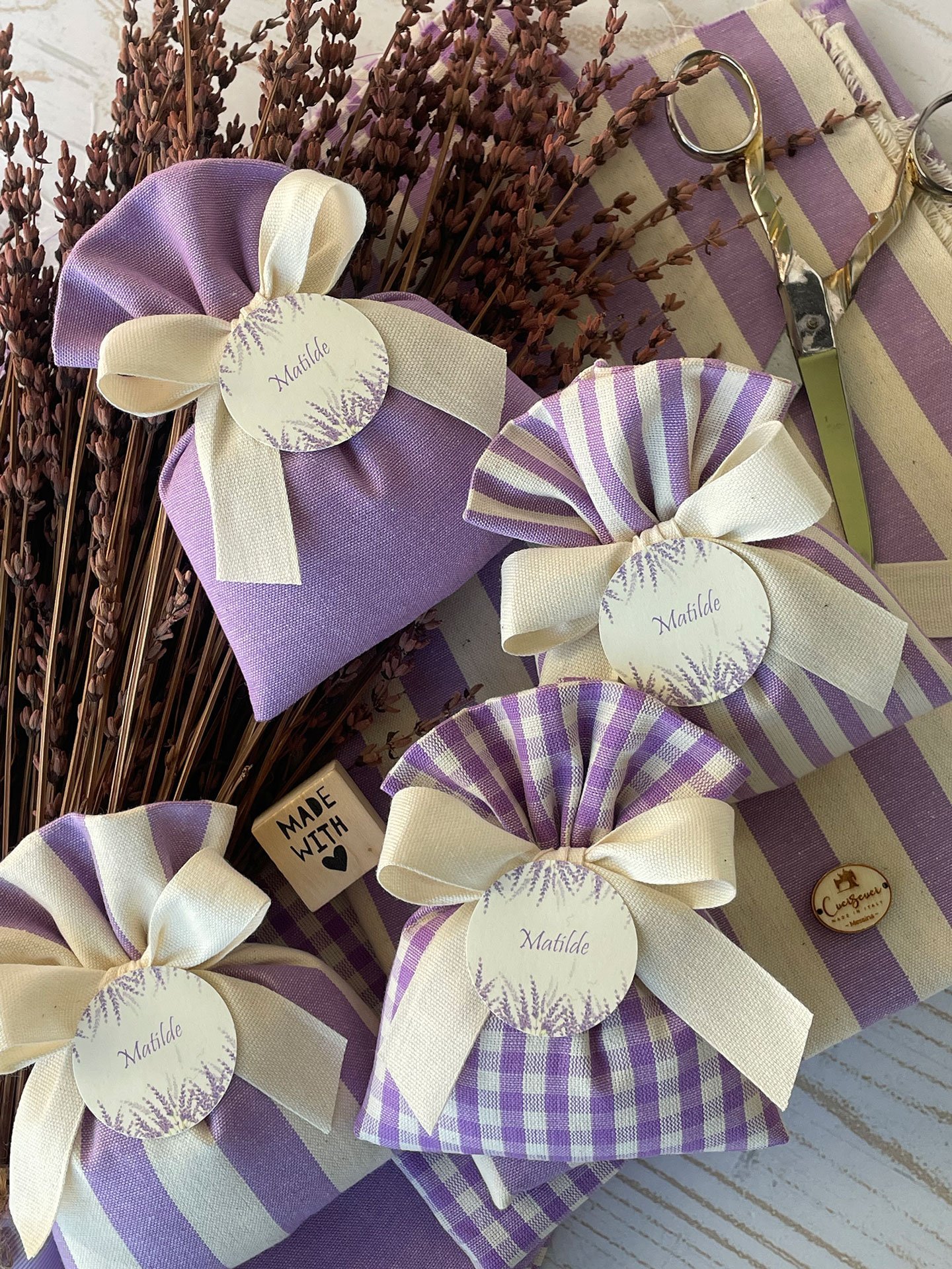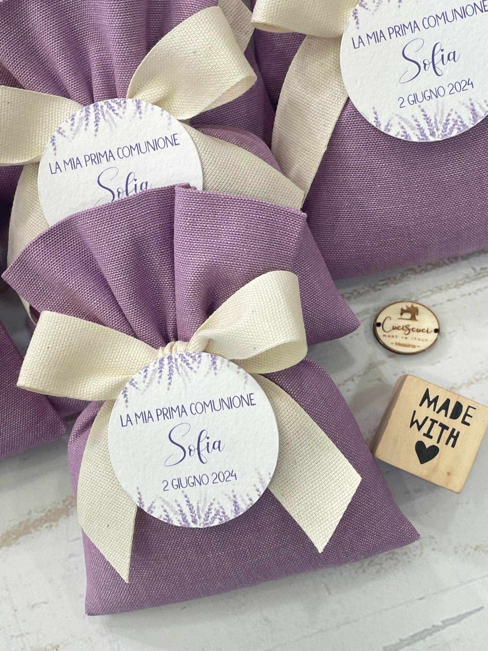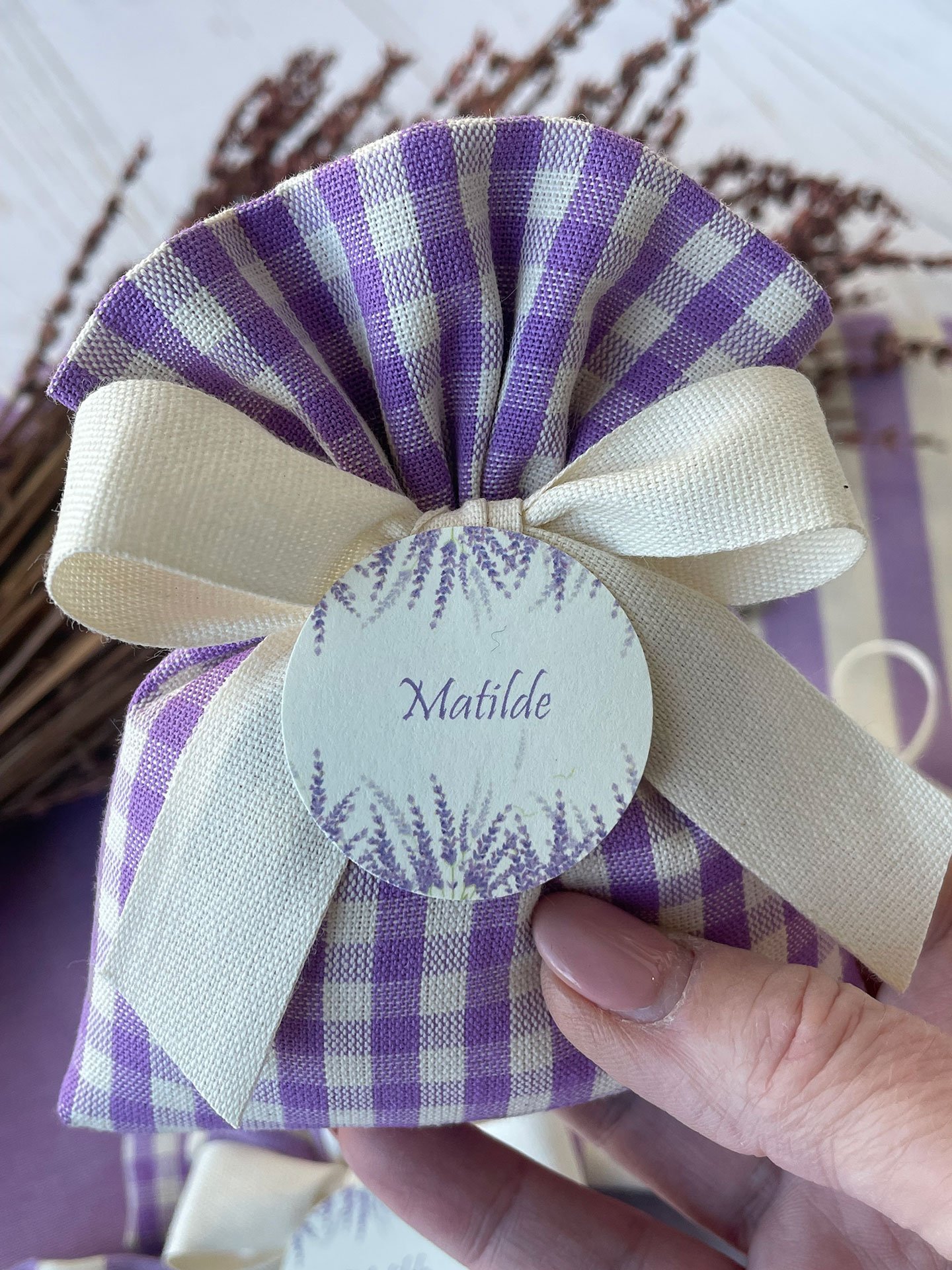 Confezionato in cotone tinto filo in fantasie assortite (o a scelta), nei raffinati toni del lilla, è la bomboniera ideale per celebrare i momenti più importanti.