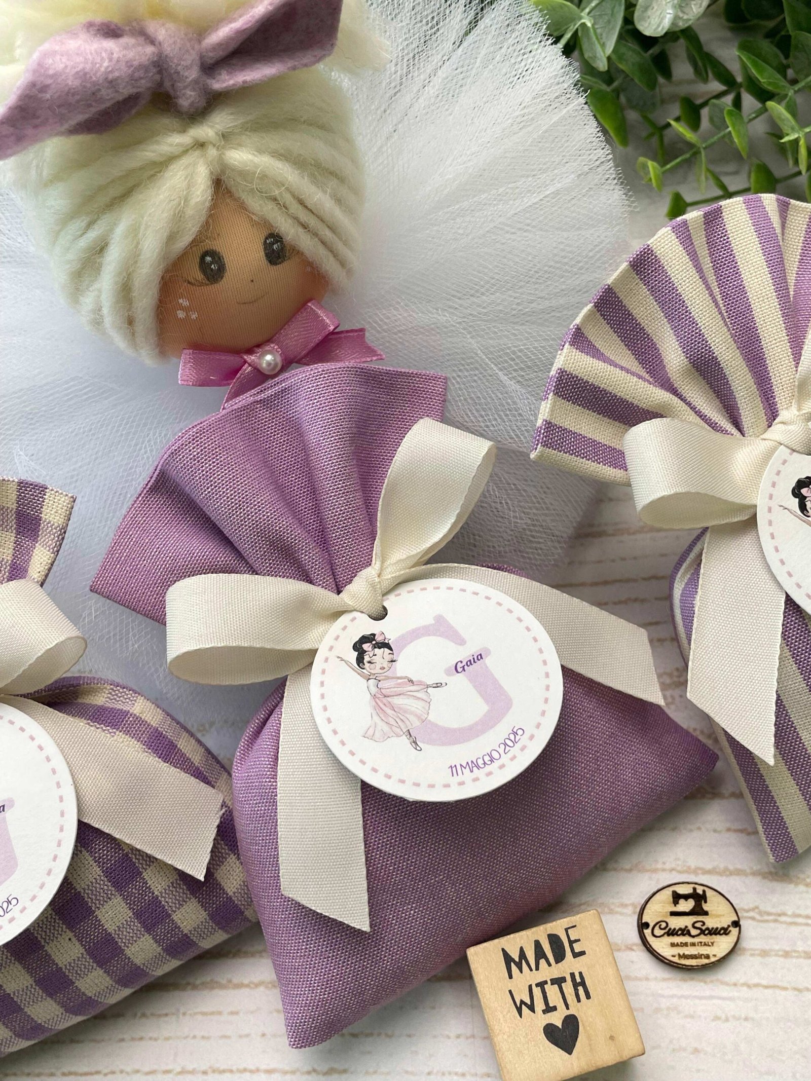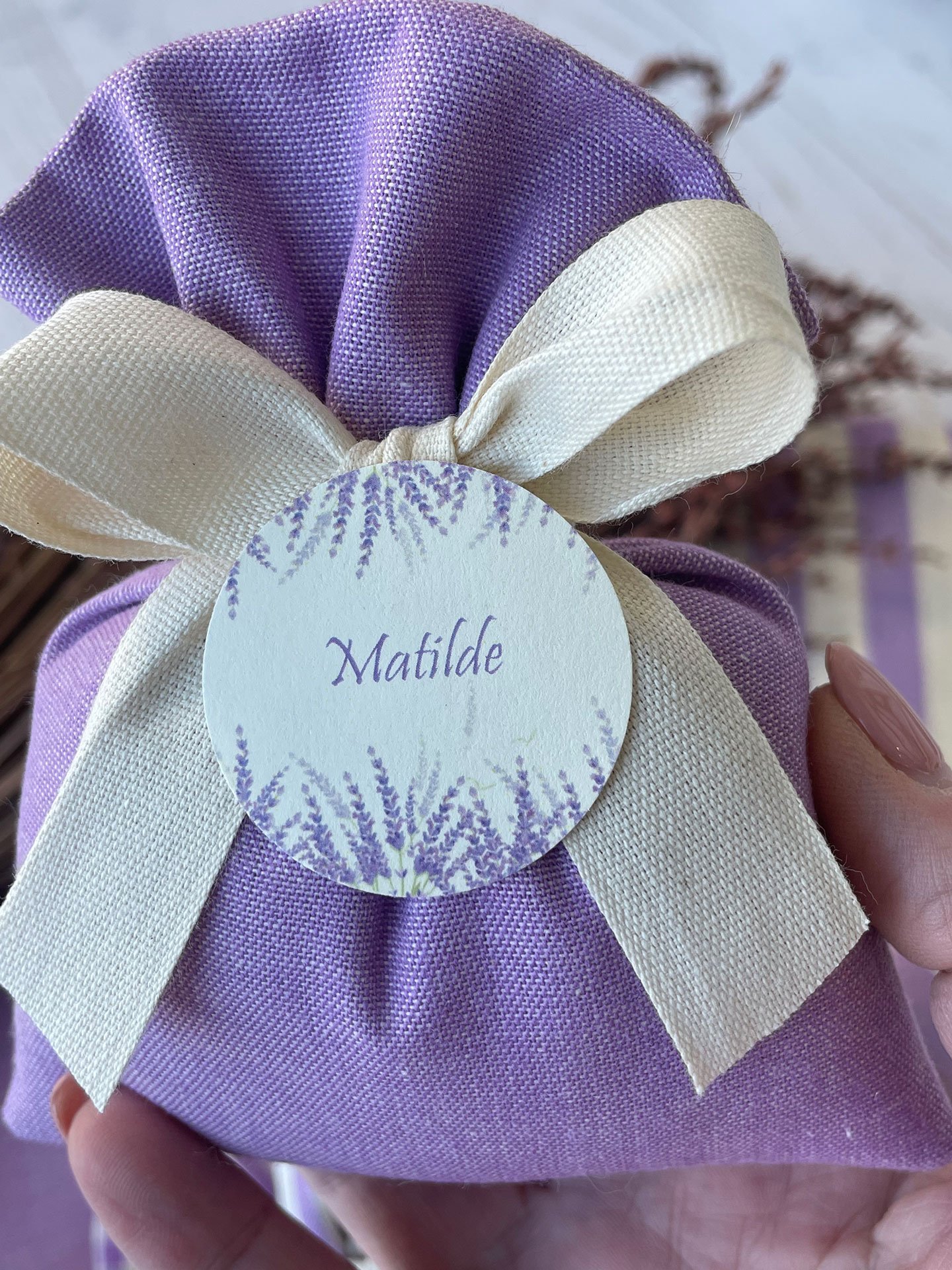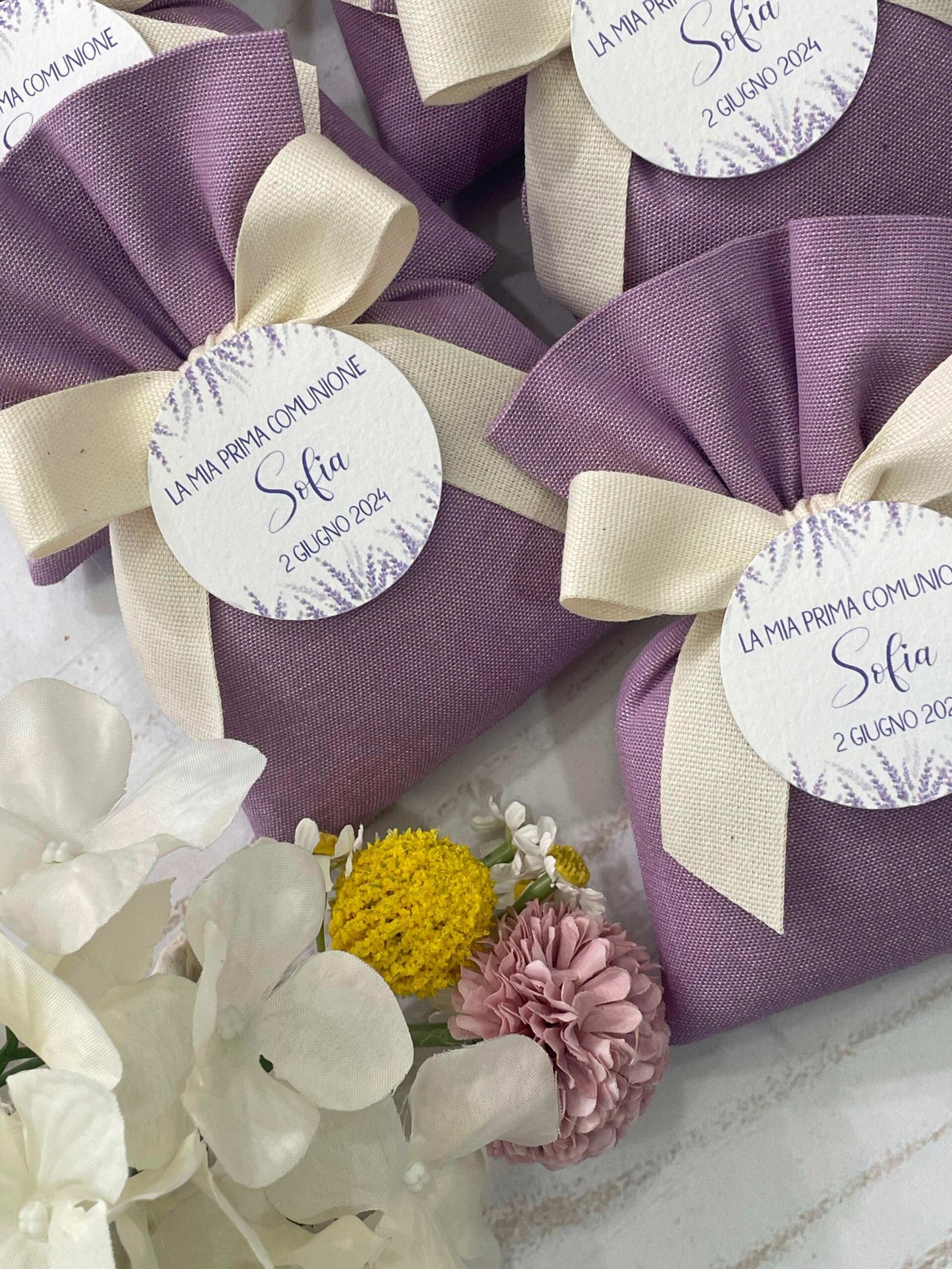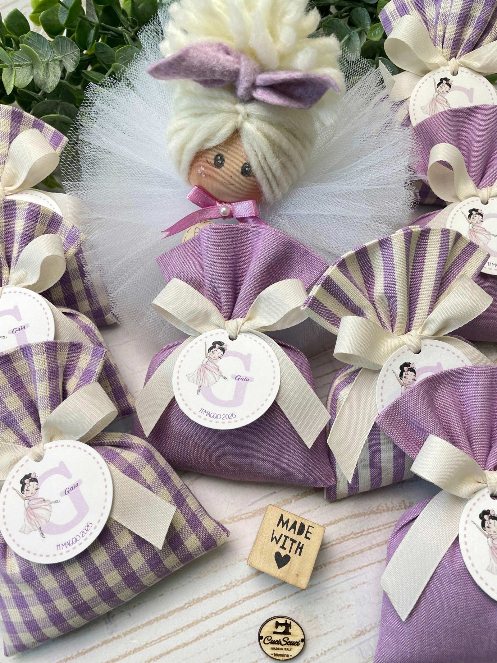 Confezionato in cotone tinto filo in fantasie assortite (o a scelta), nei raffinati toni del lilla, è la bomboniera ideale per celebrare i momenti più importanti.