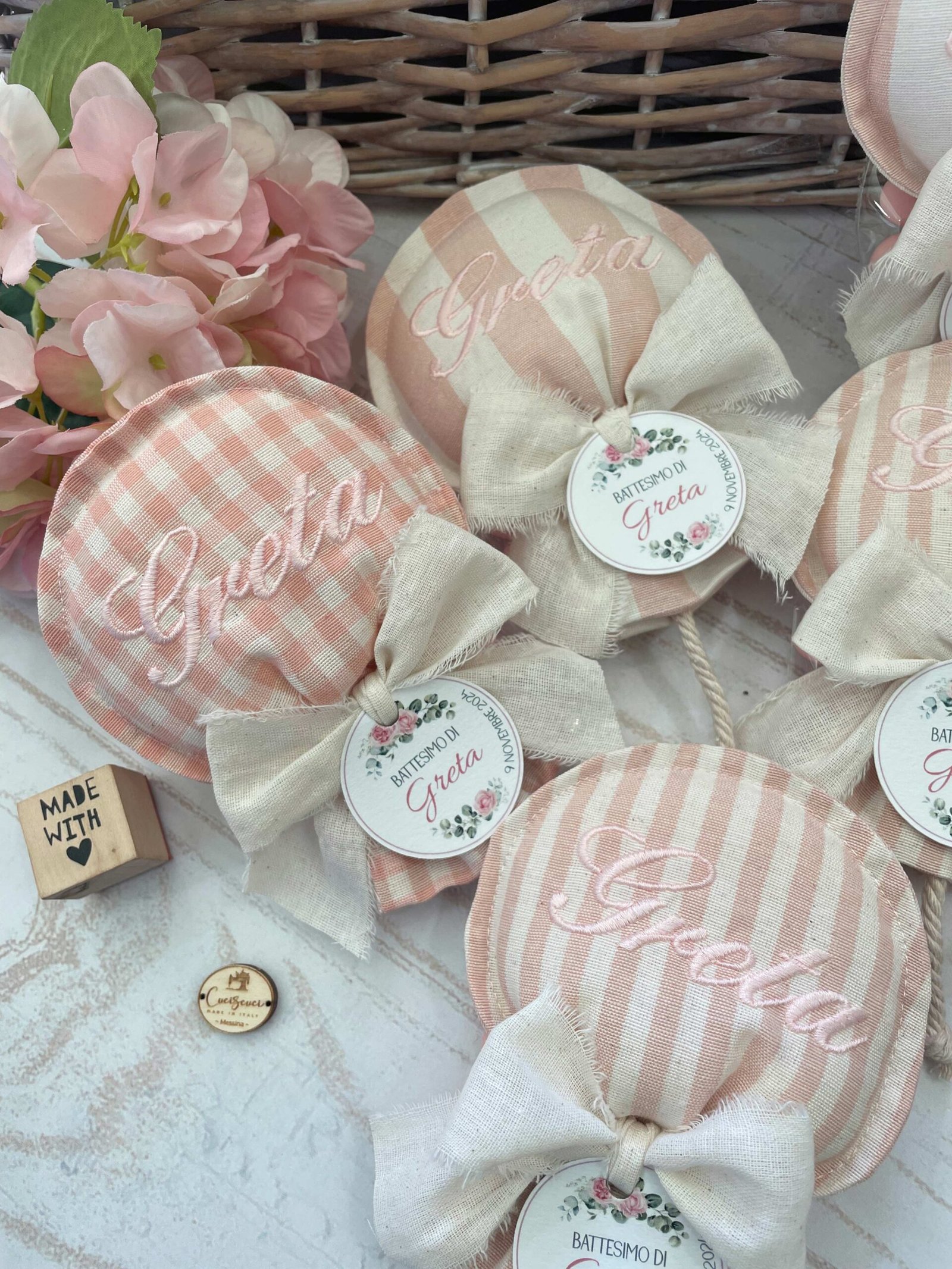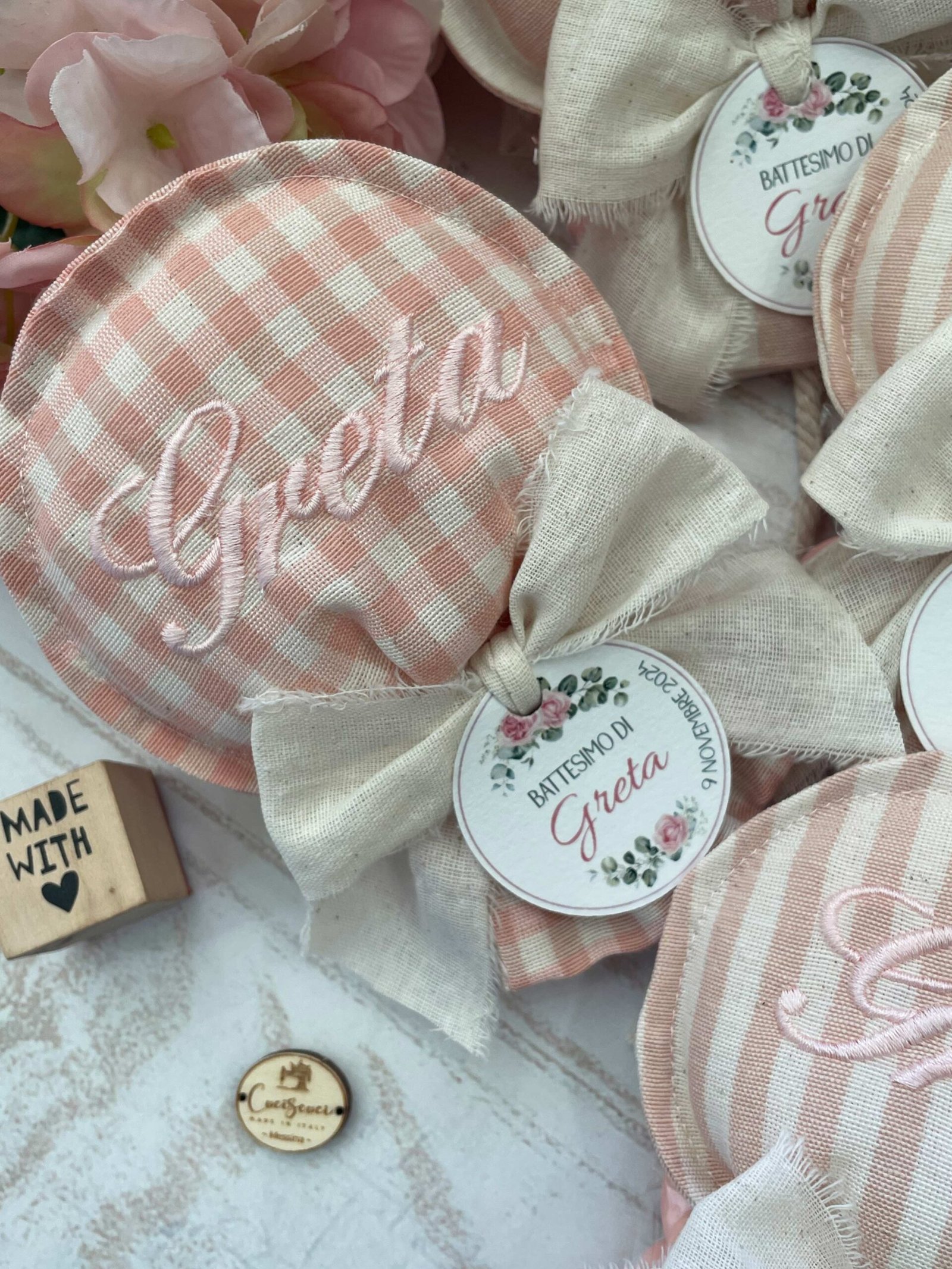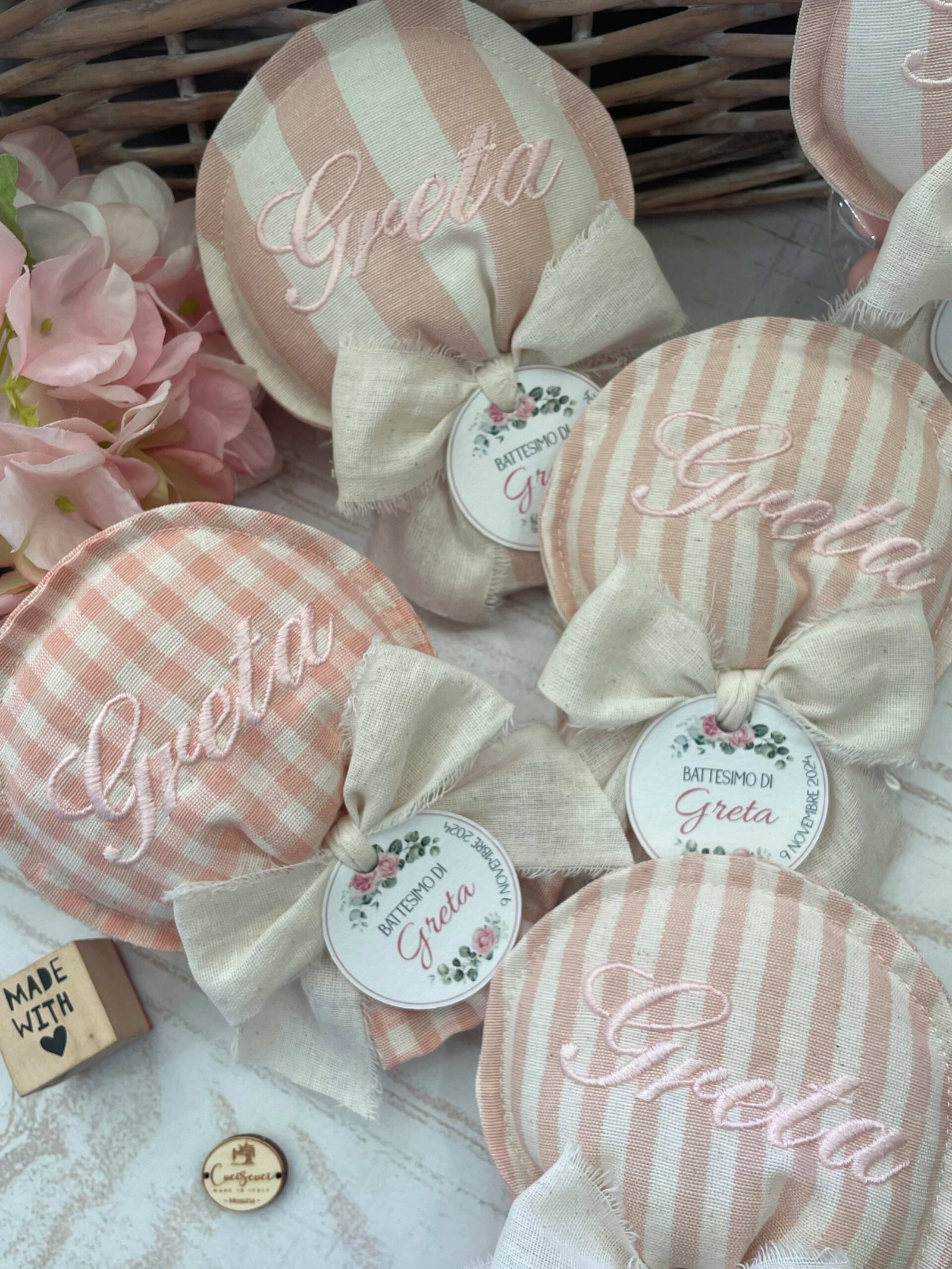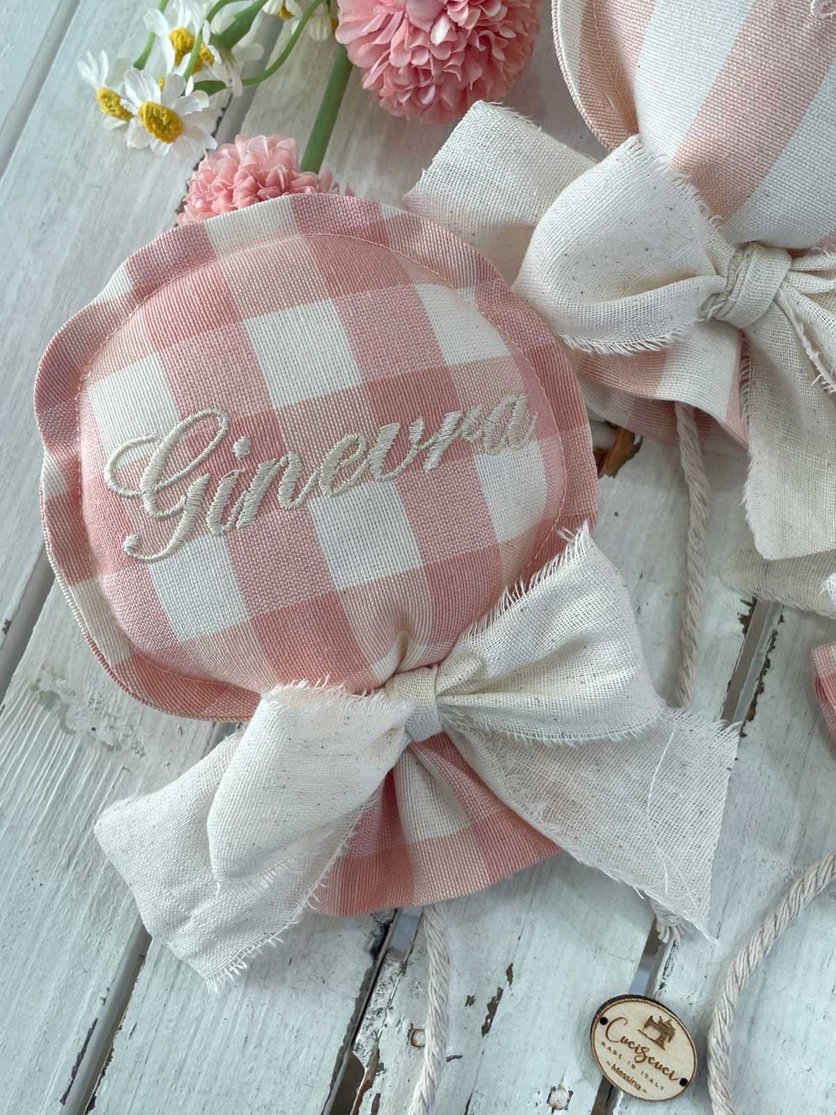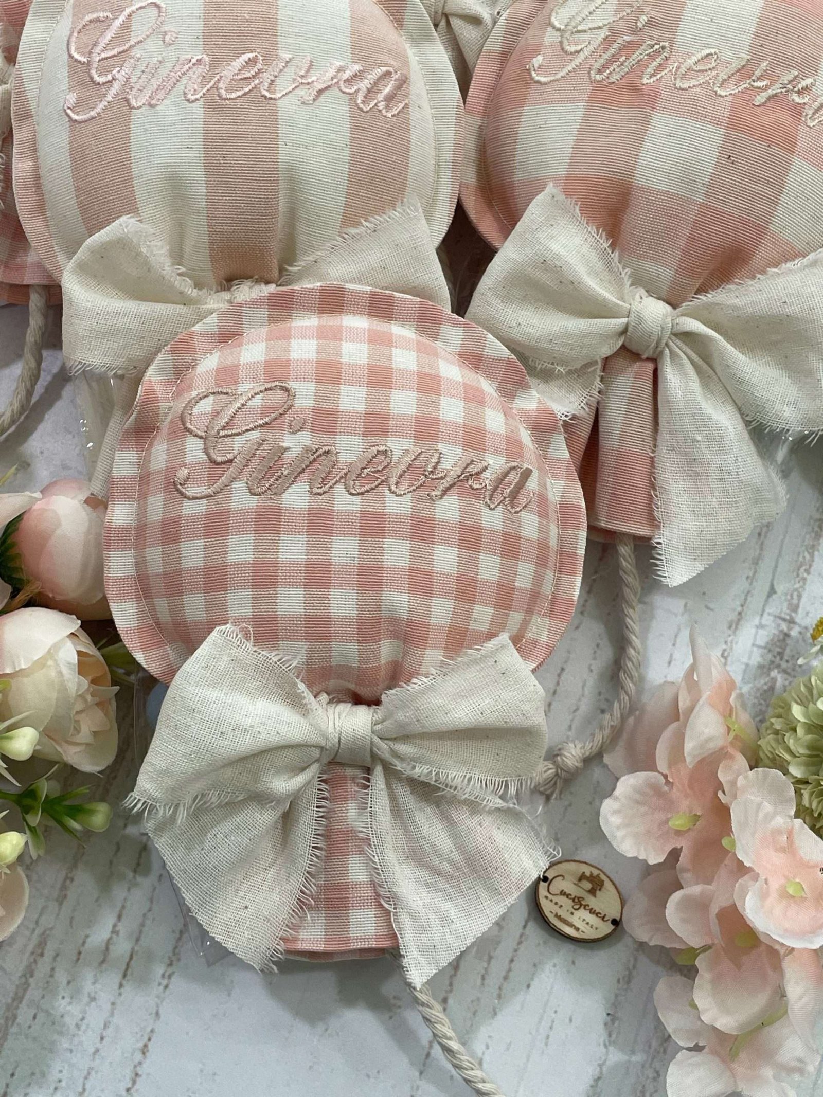 Questo sacchetto in cotone rodas è disponibile in fantasie assortite (o a scelta) nei delicati toni del rosa pesca, con il ricamo personalizzato del nome della bimba, per un dono unico e speciale.