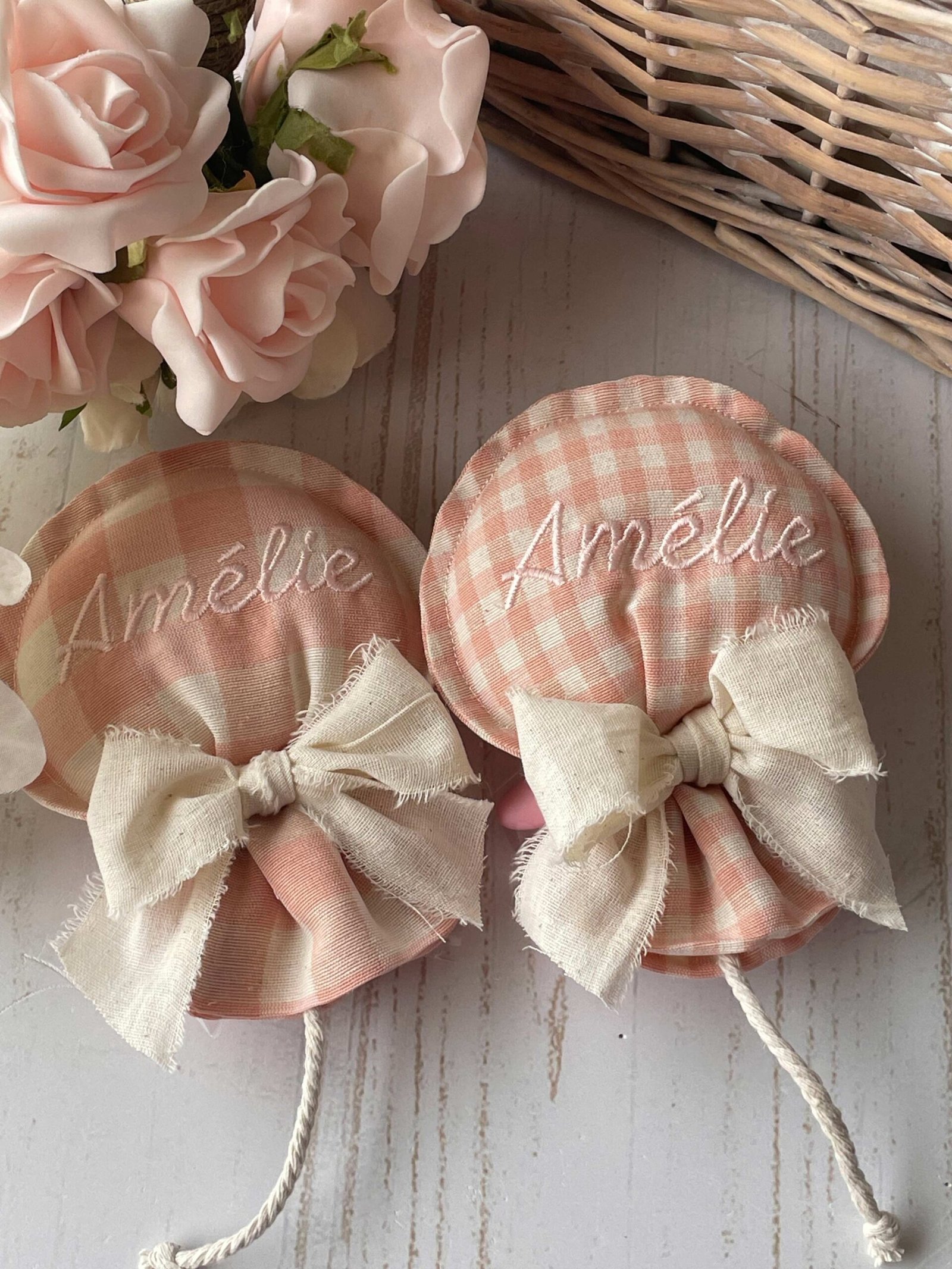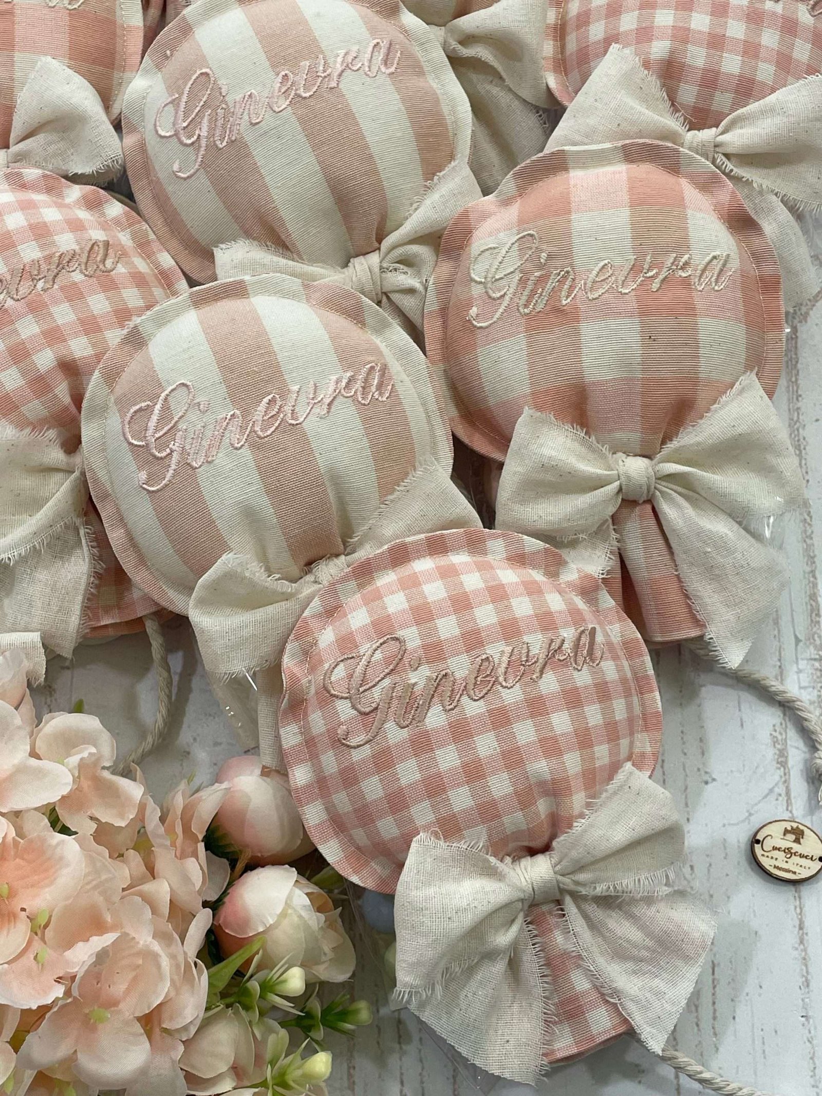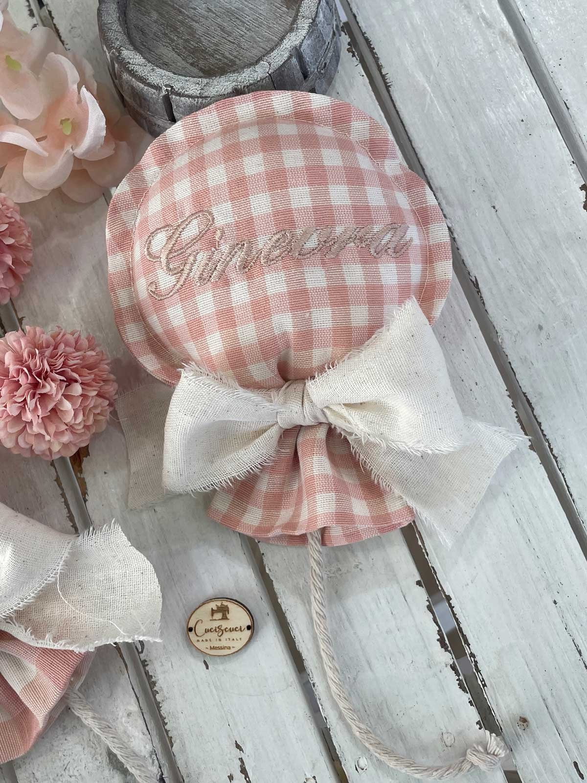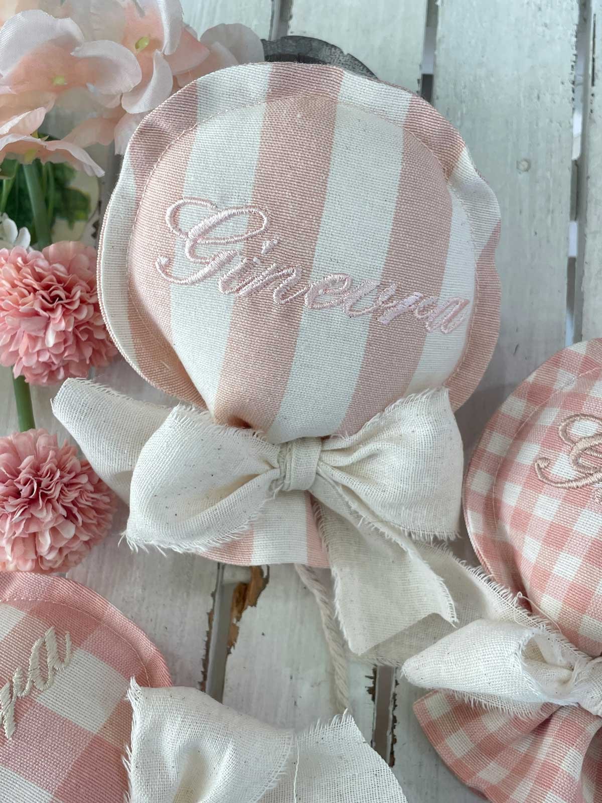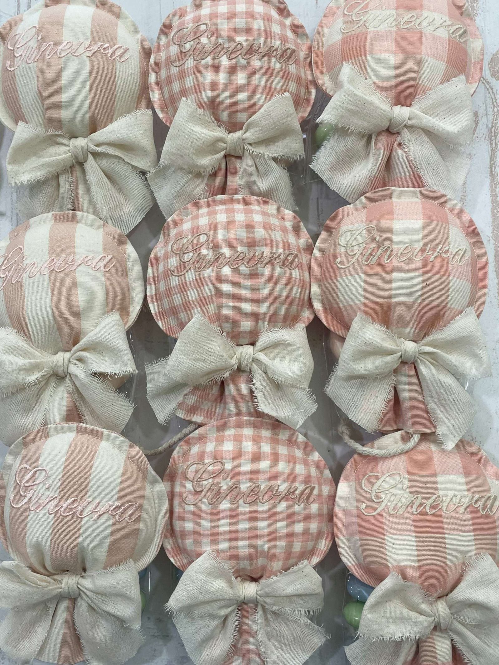 Questo sacchetto in cotone rodas è disponibile in fantasie assortite (o a scelta) nei delicati toni del rosa pesca, con il ricamo personalizzato del nome della bimba, per un dono unico e speciale.