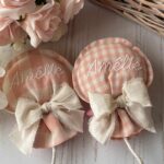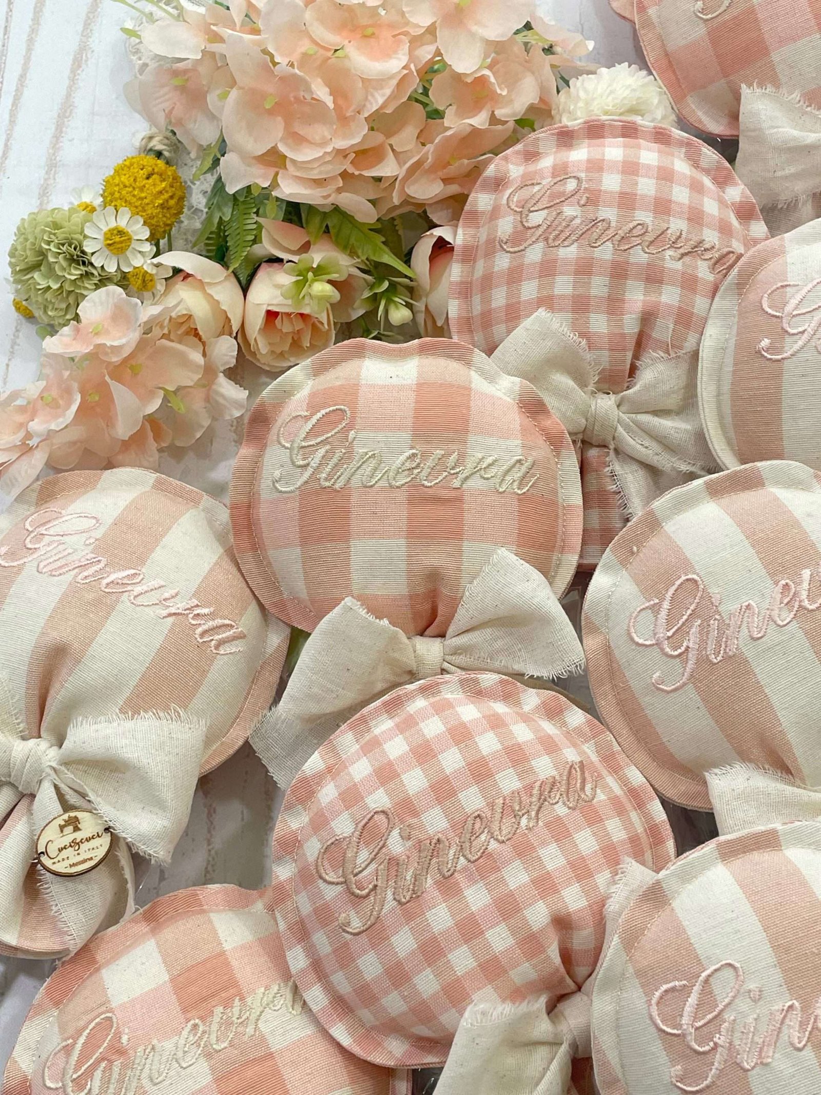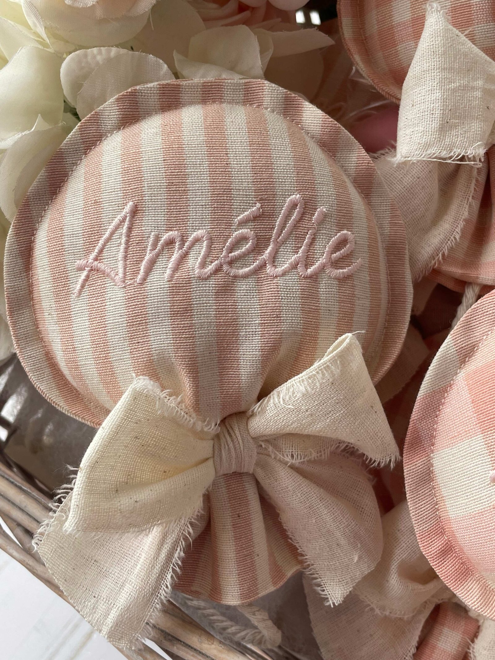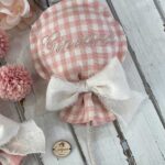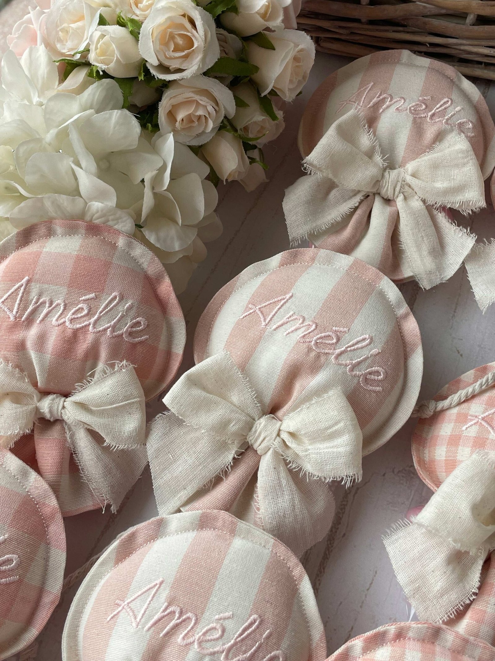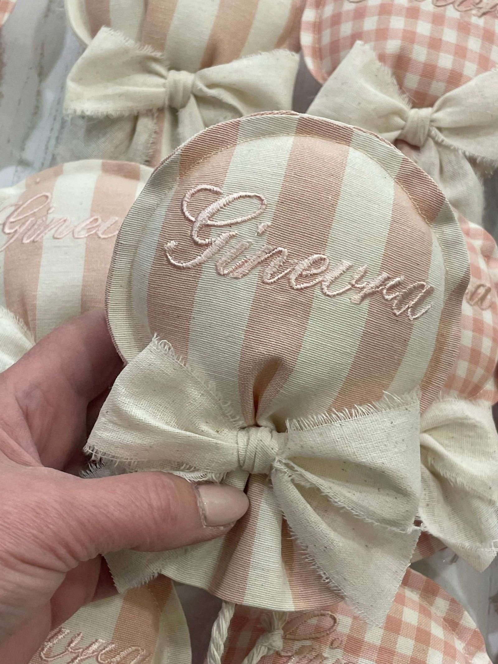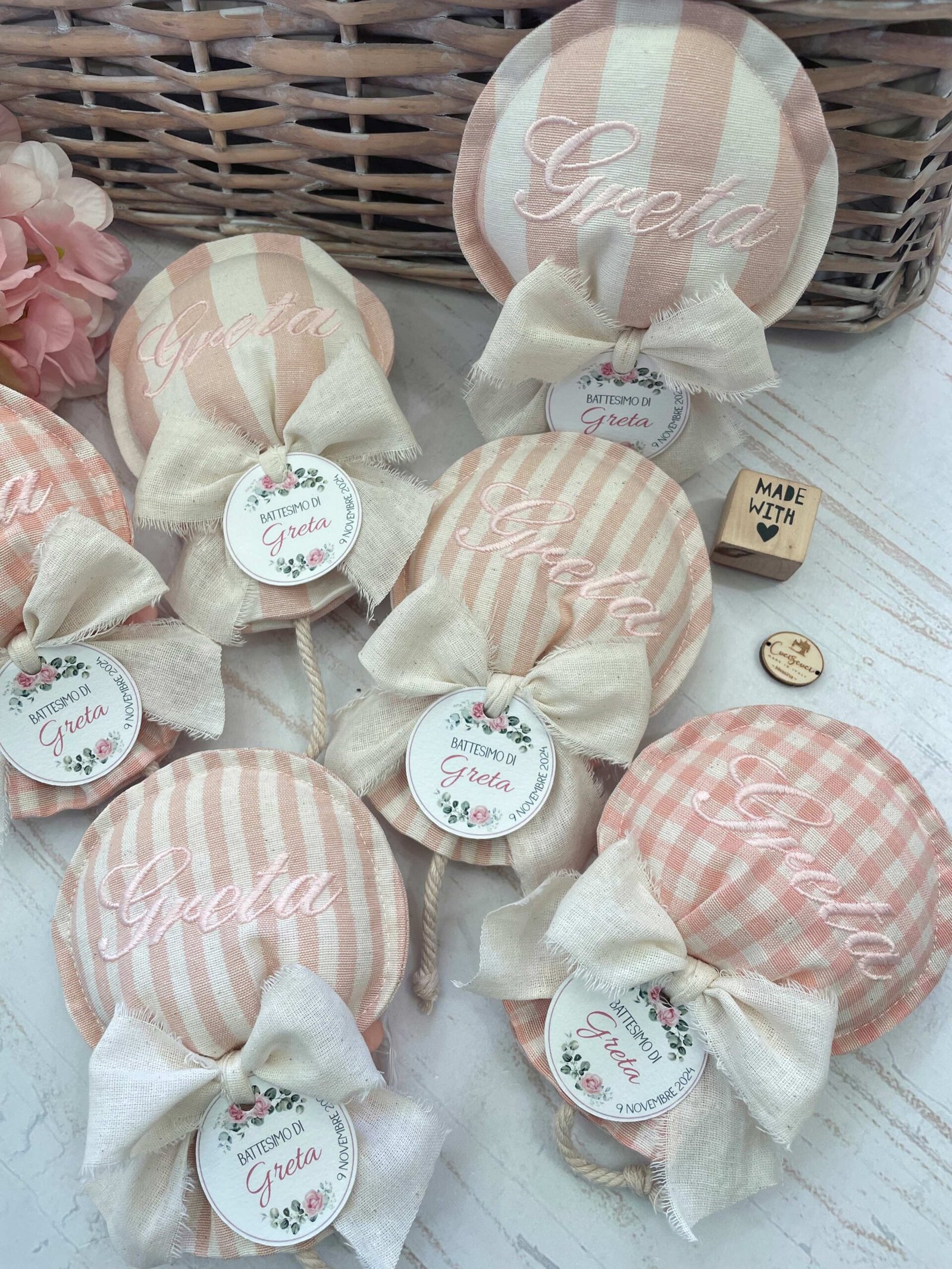 Questo sacchetto in cotone rodas è disponibile in fantasie assortite (o a scelta) nei delicati toni del rosa pesca, con il ricamo personalizzato del nome della bimba, per un dono unico e speciale.