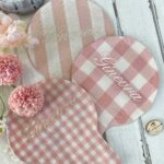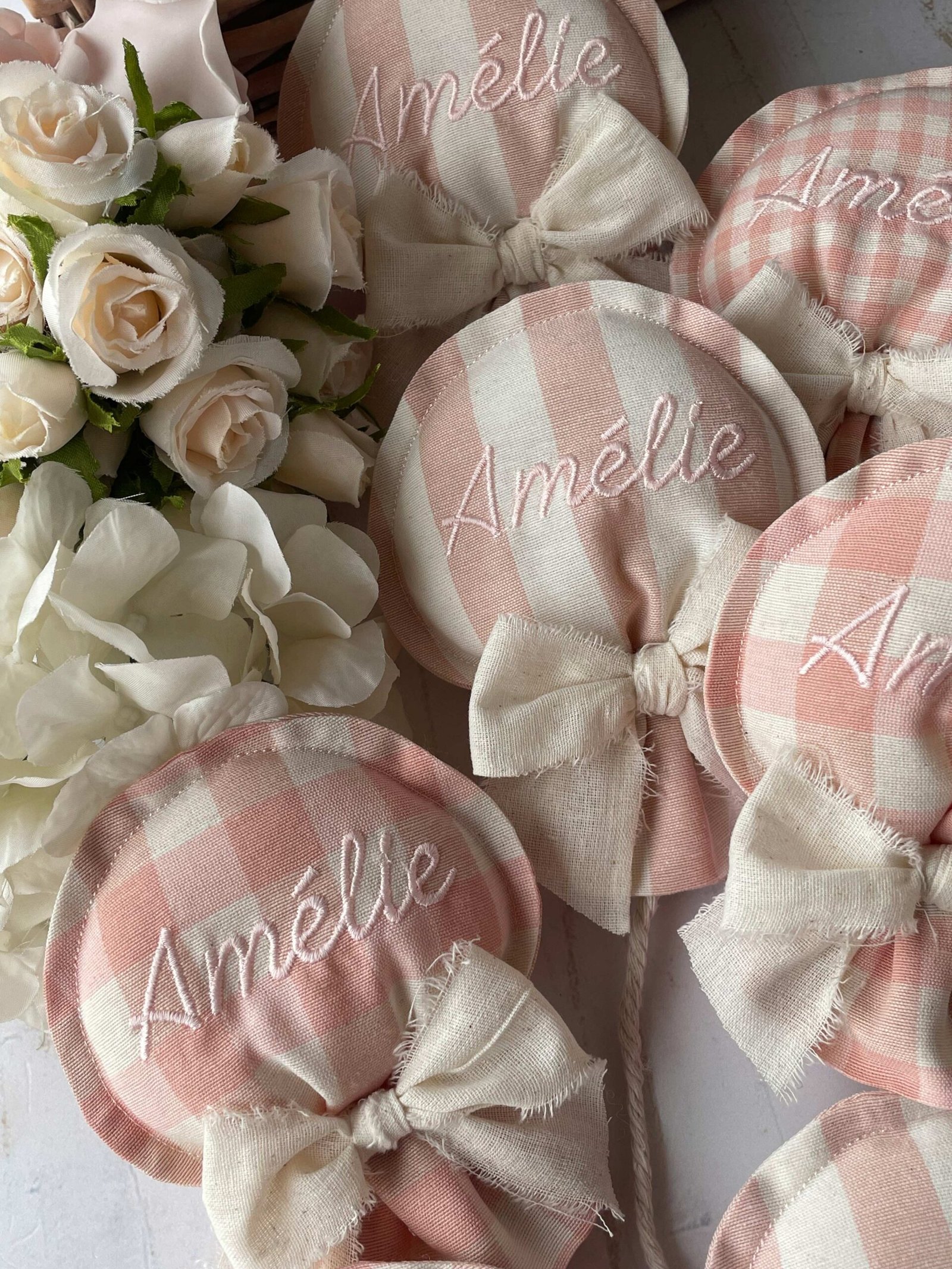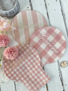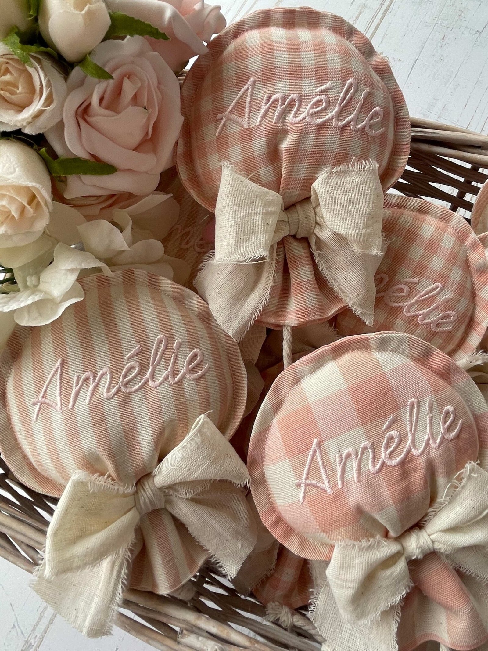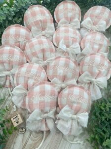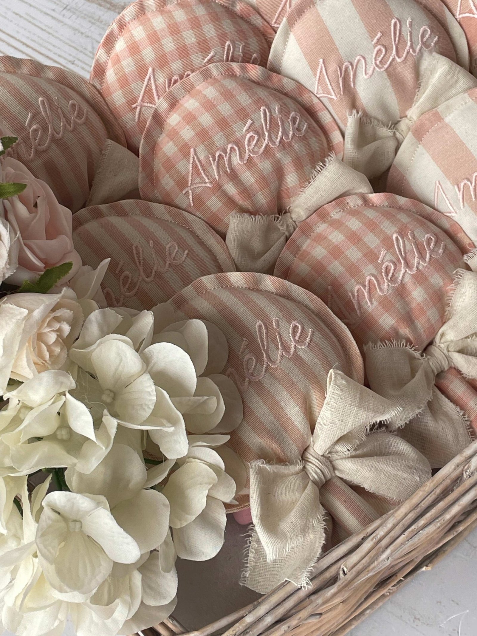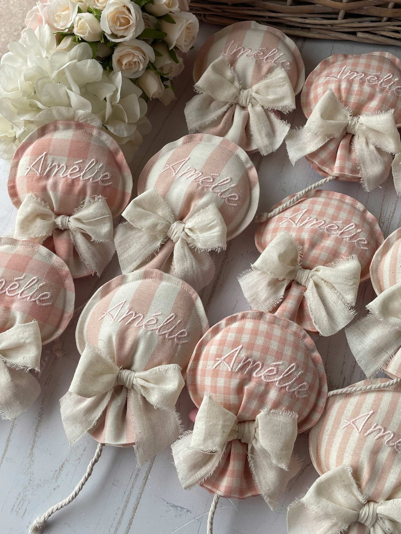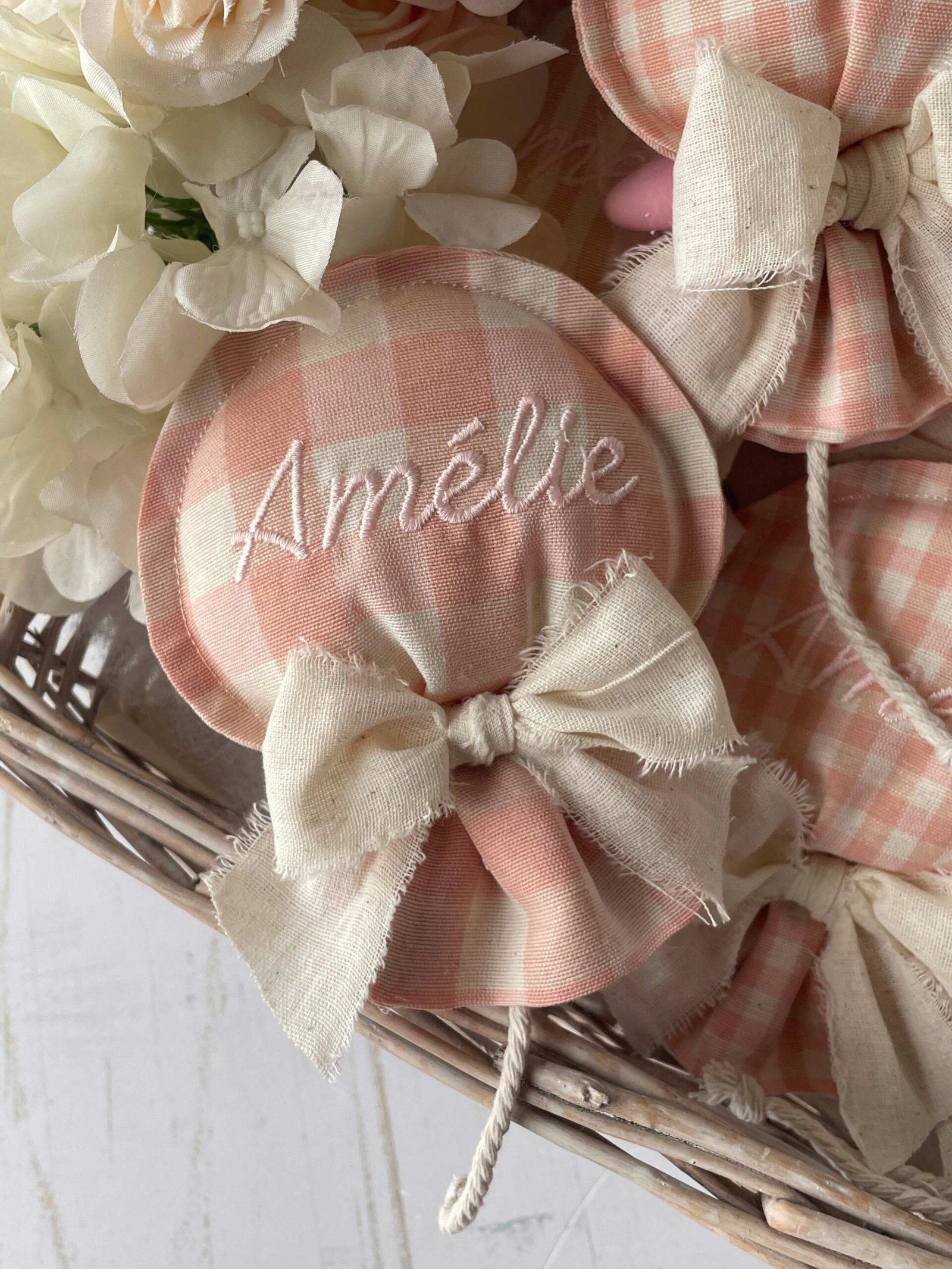 Questo sacchetto in cotone rodas è disponibile in fantasie assortite (o a scelta) nei delicati toni del rosa pesca, con il ricamo personalizzato del nome della bimba, per un dono unico e speciale.