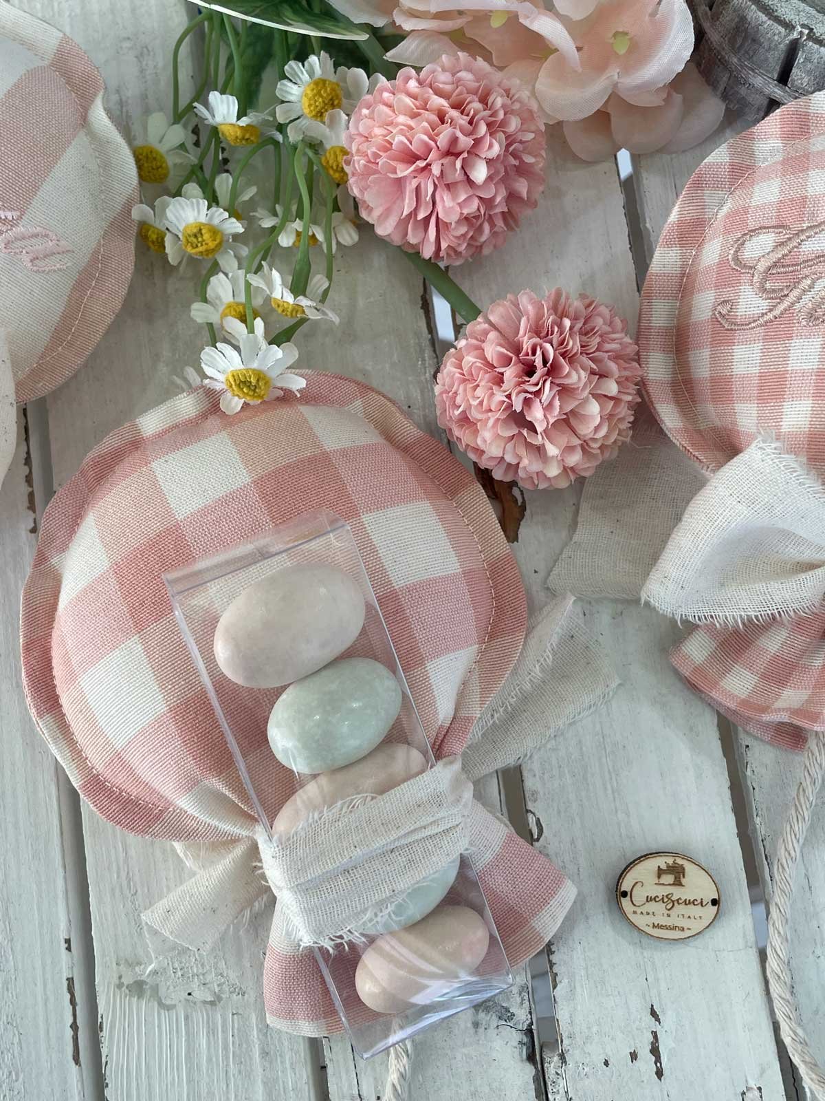 Confezionato: bomboniera pronta da donare, completa di sacchetto ricamato, imbottitura in ovatta, fiocco abbinato e 5 confetti in busta sigillata