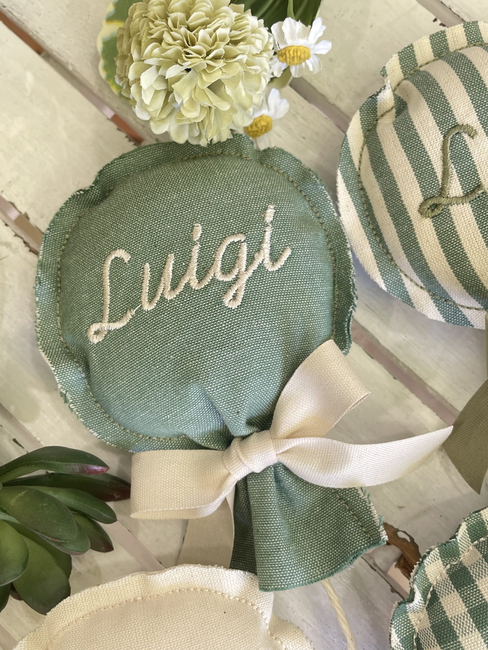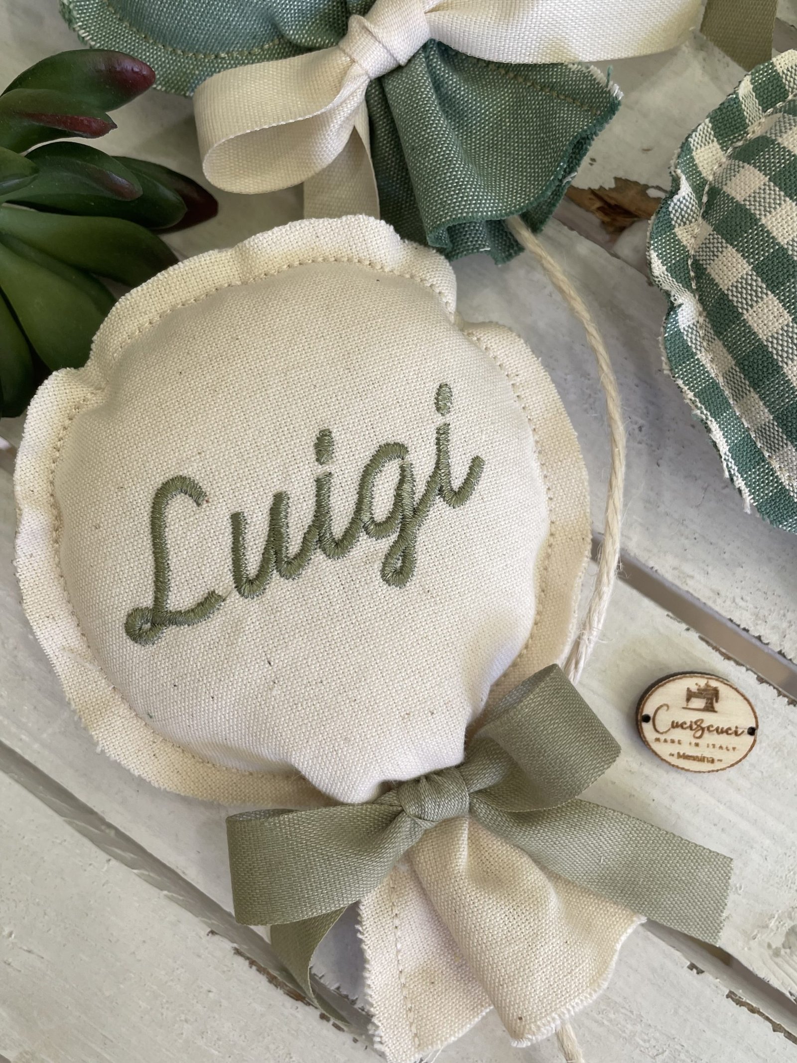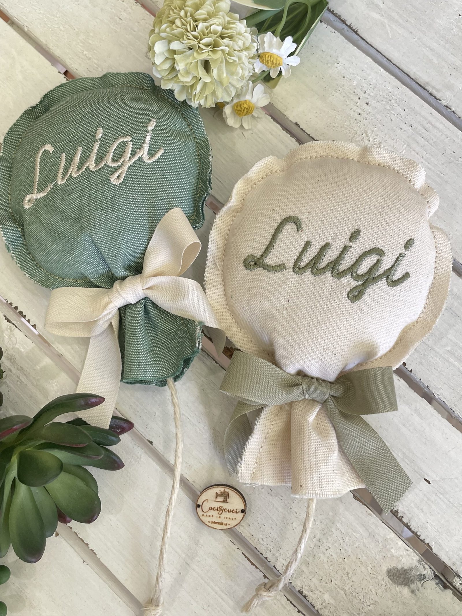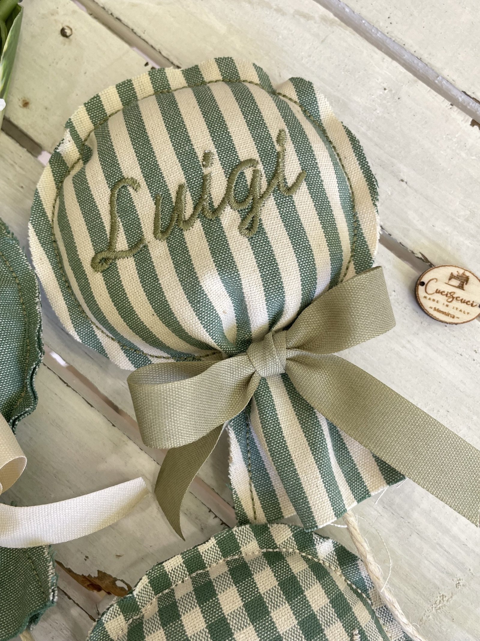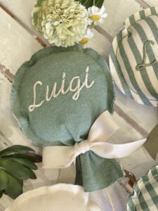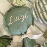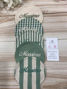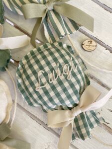 Il nome da ricamare può essere indicato nelle note dell’ordine insieme alla preferenza della fantasia tessuto.
