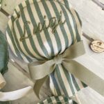 Questo speciale sacchetto a forma di palloncino è confezionato in cotone tinto filo, disponibile in fantasie assortite o a scelta, nei toni del verde e del panna.