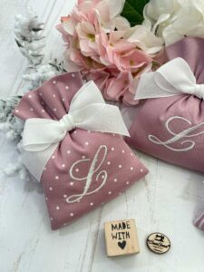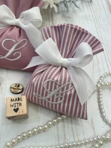 Un’elegante bomboniera artigianale, realizzata interamente a mano nella nostra sartoria con passione e cura per i dettagli. Questo sacchetto in rigatino di cotone è disponibile in fantasie assortite (o a scelta) nei delicati toni rosa antico, impreziosito dal ricamo personalizzato di un’iniziale, per un tocco unico e raffinato.