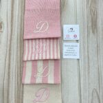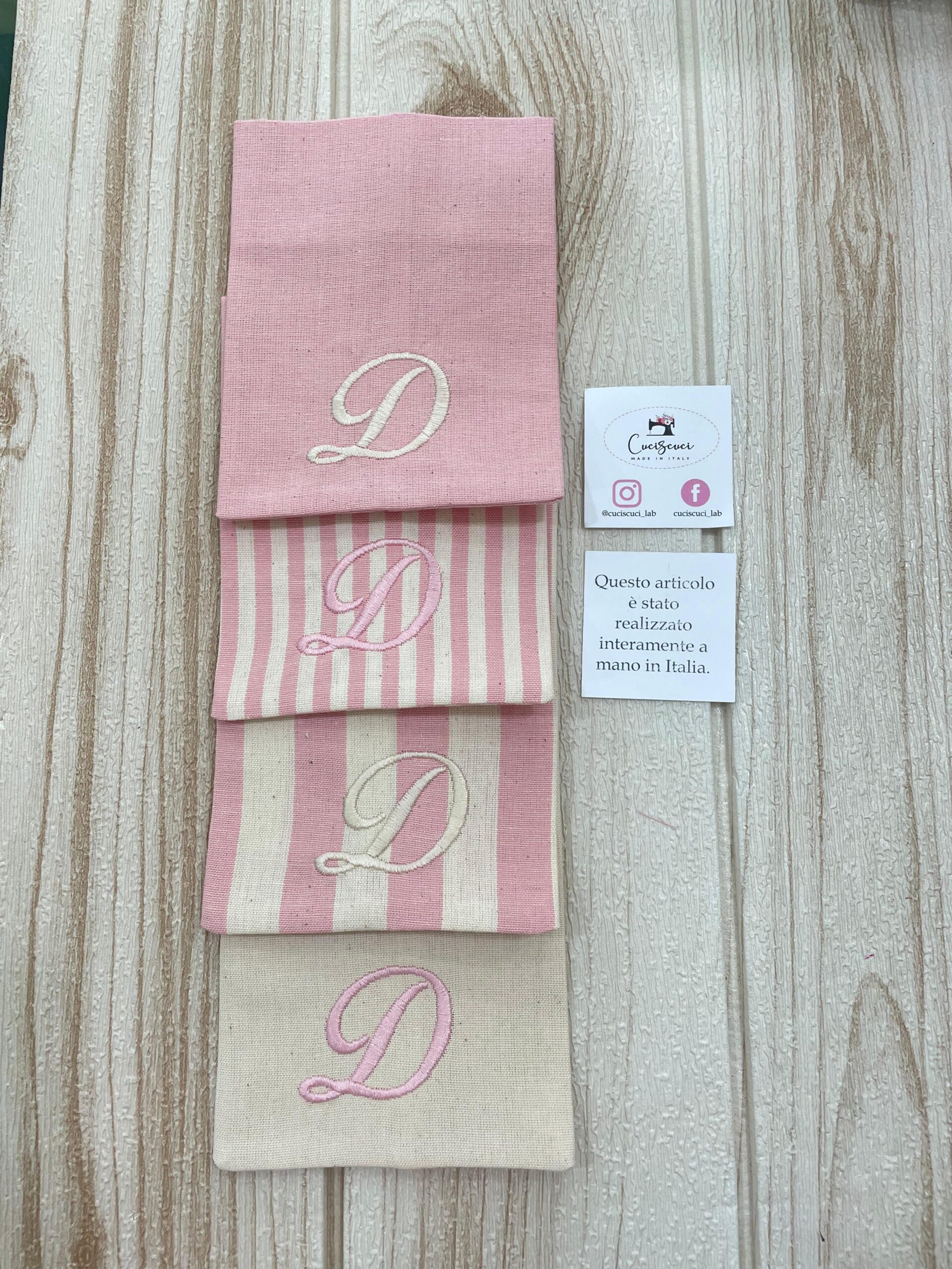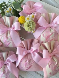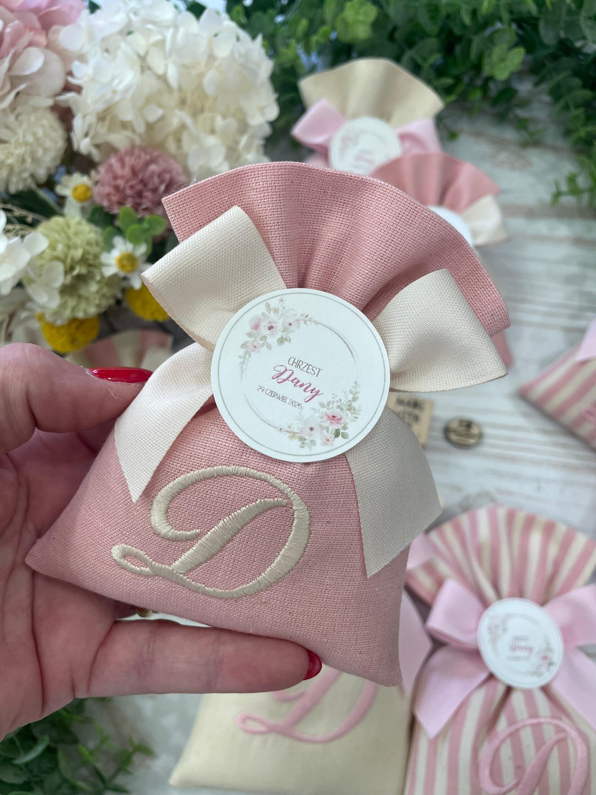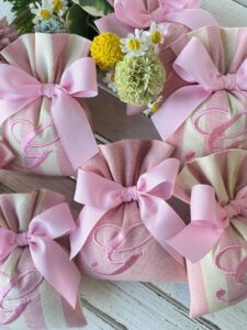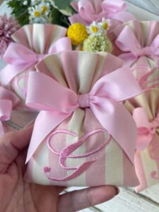 Confezionato in cotone tinto filo nei delicati toni del rosa baby, ogni pezzo è impreziosito dal ricamo di un’iniziale, rendendo ogni bomboniera unica, elegante e dal tocco personale.