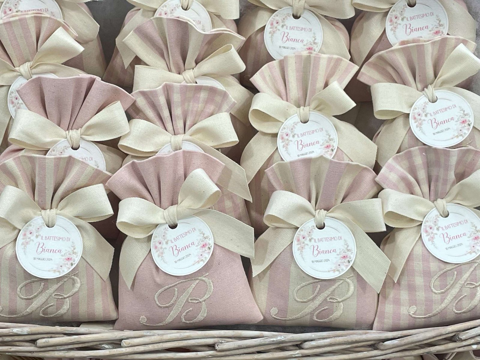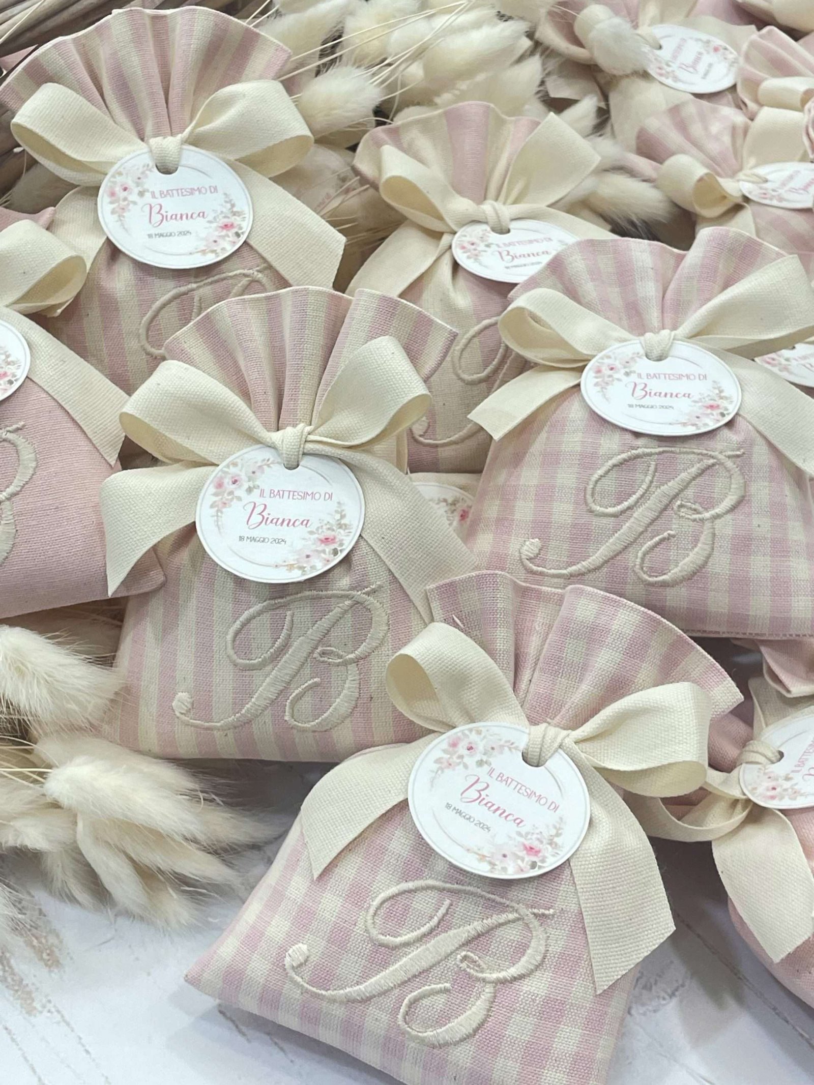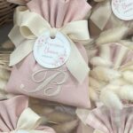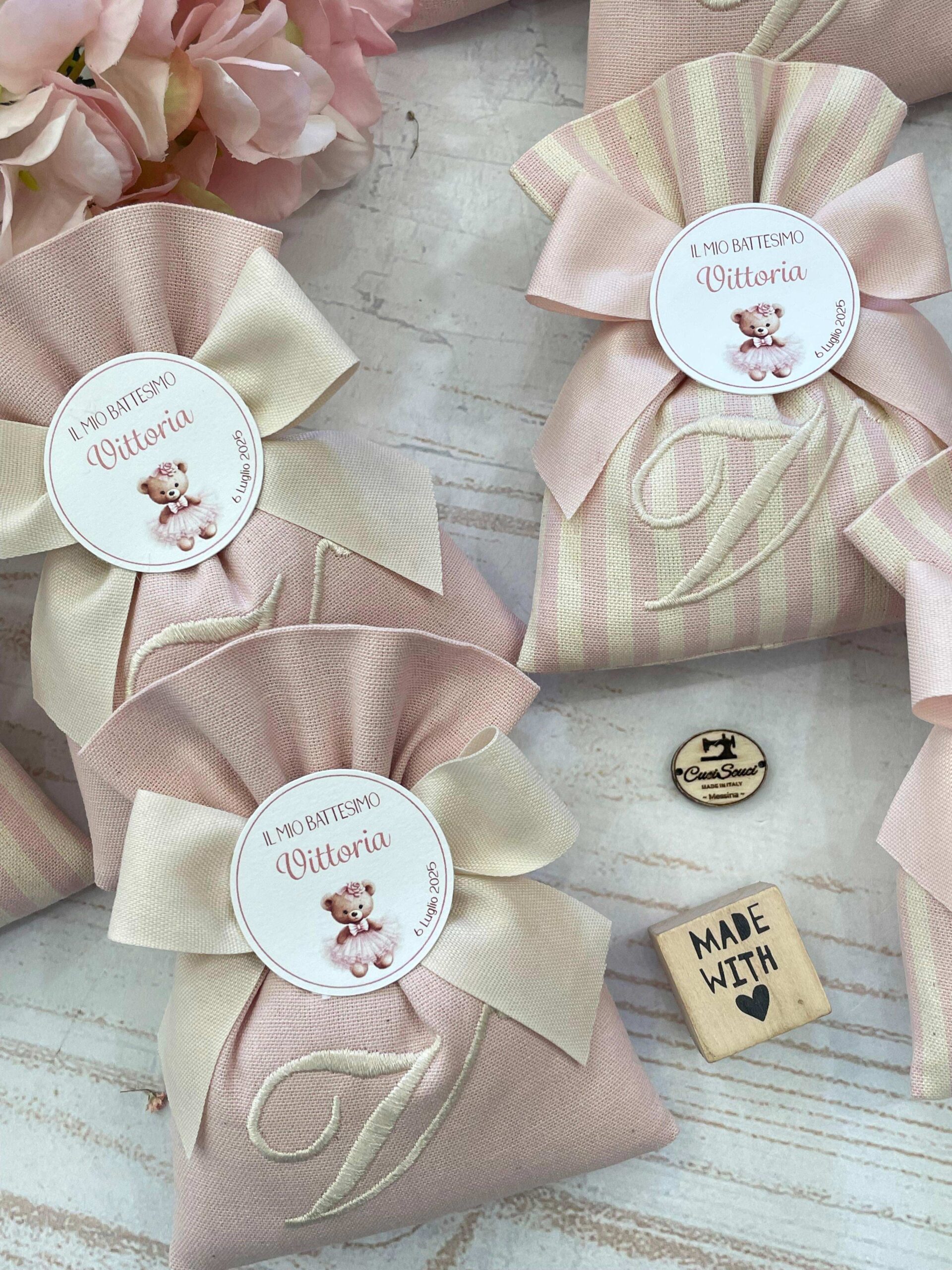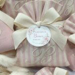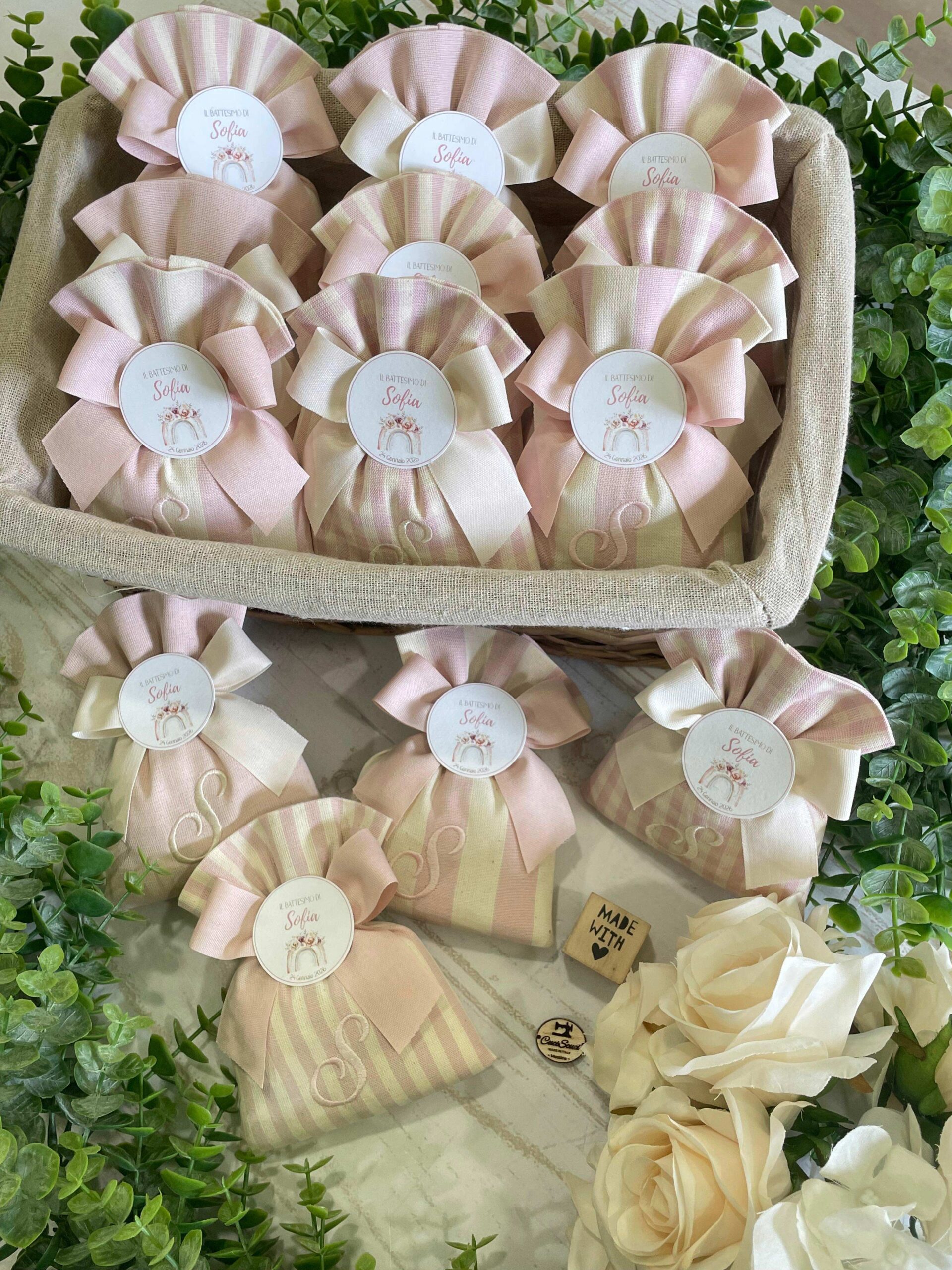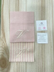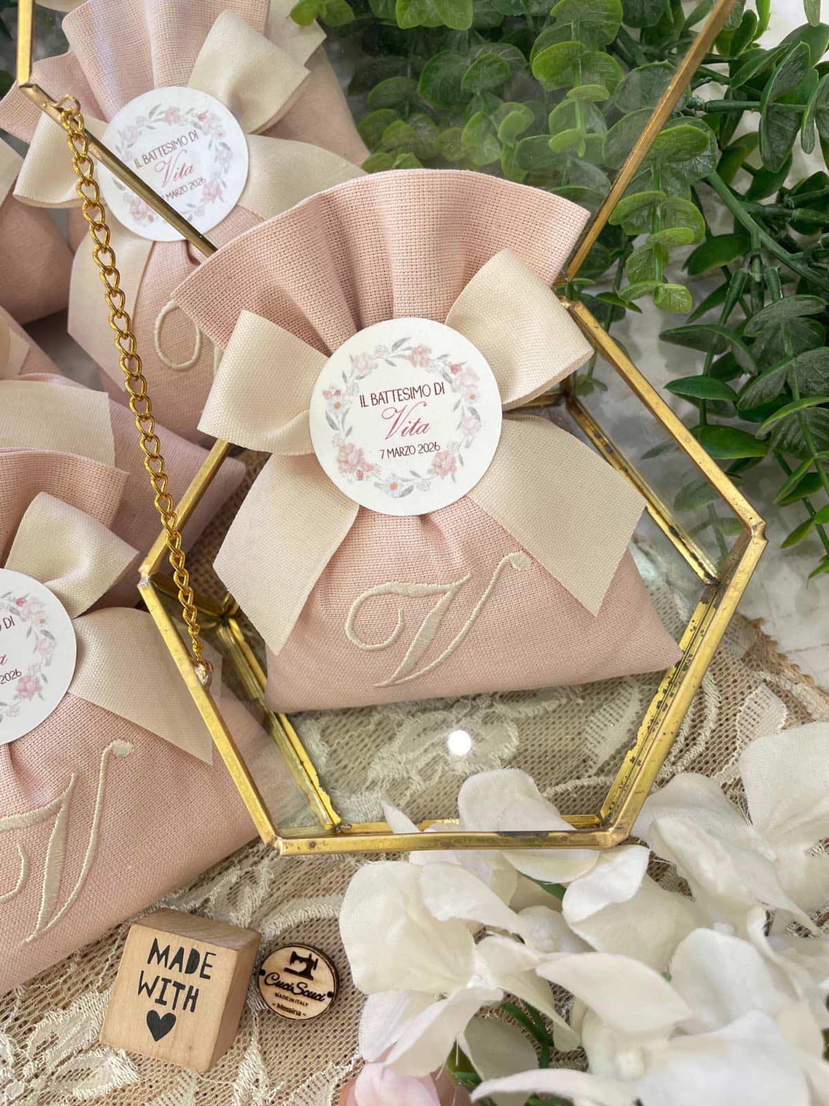 Il sacchetto, confezionato in pregiato cotone tinto filo nei delicati toni del rosa cipria, è disponibile in fantasie assortite (o su richiesta) e impreziosito dal ricamo di un’iniziale, per un tocco personale e raffinato.