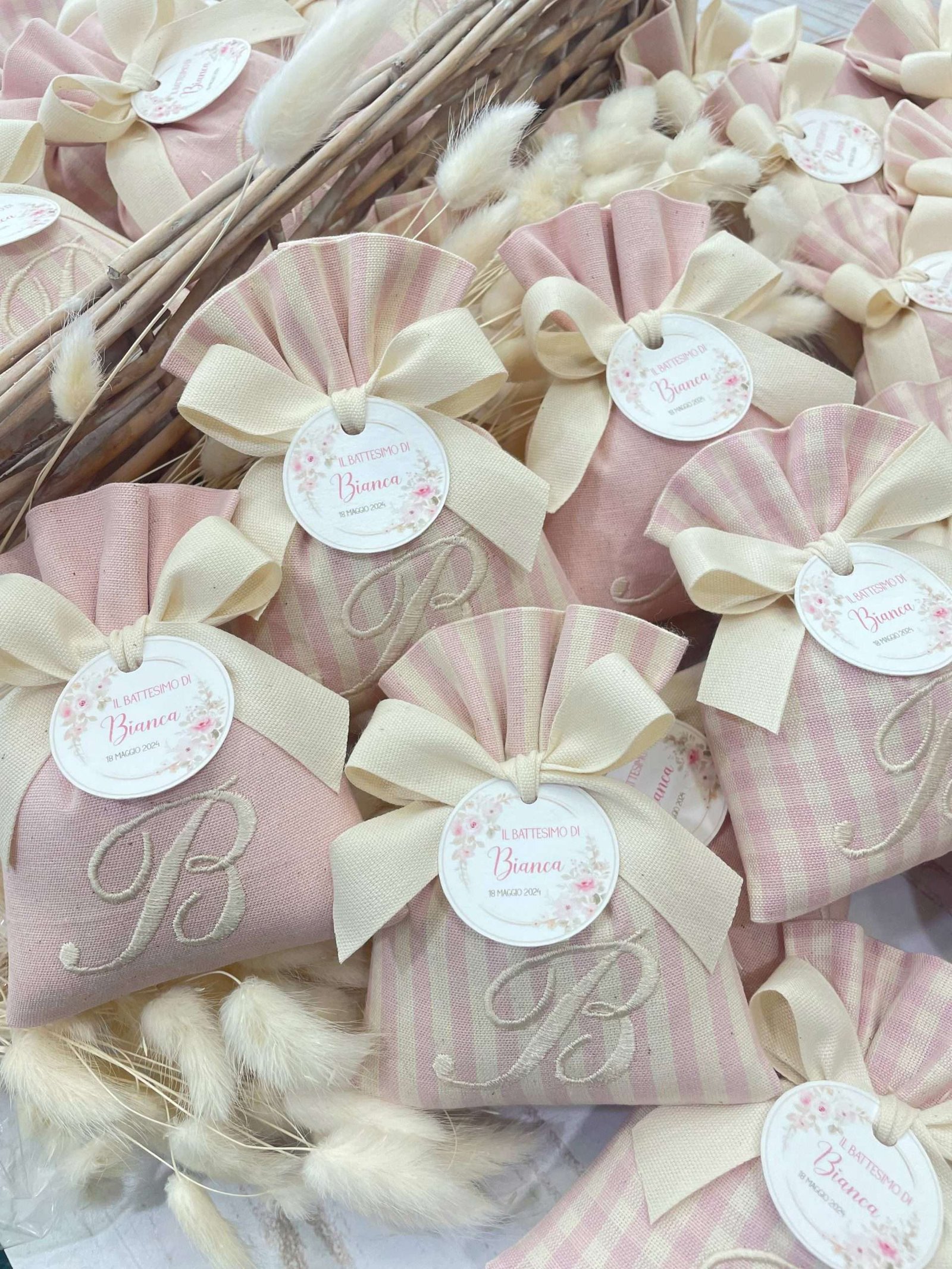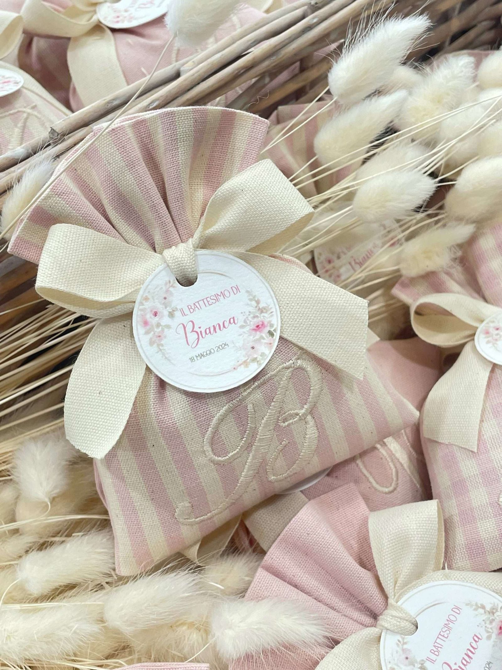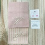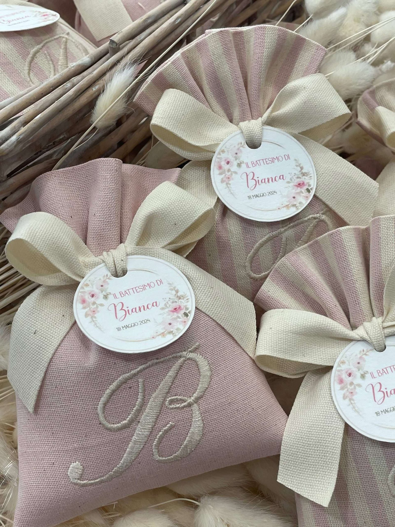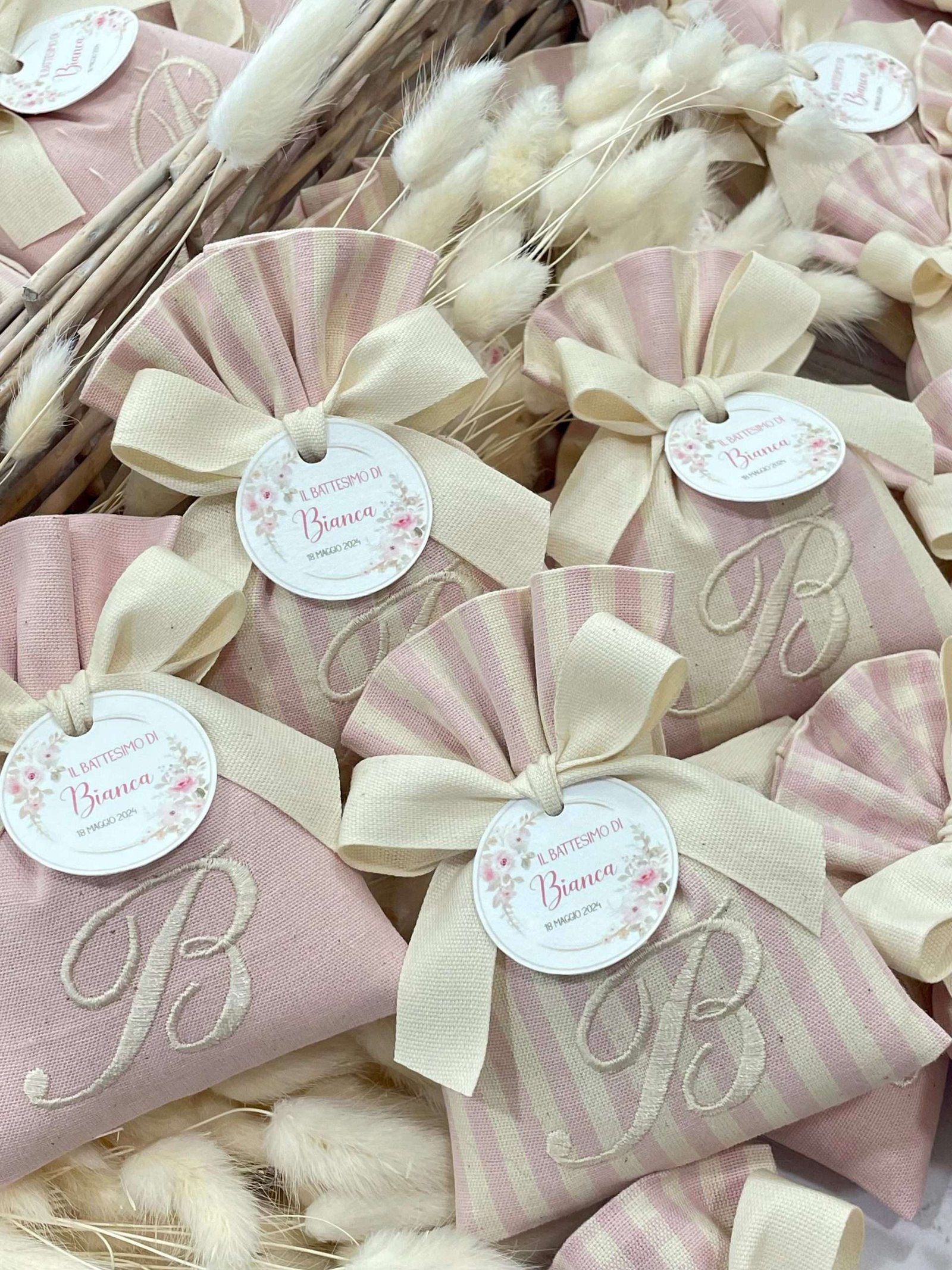 Il sacchetto, confezionato in pregiato cotone tinto filo nei delicati toni del rosa cipria, è disponibile in fantasie assortite (o su richiesta) e impreziosito dal ricamo di un’iniziale, per un tocco personale e raffinato.