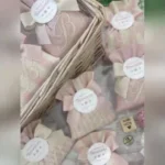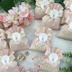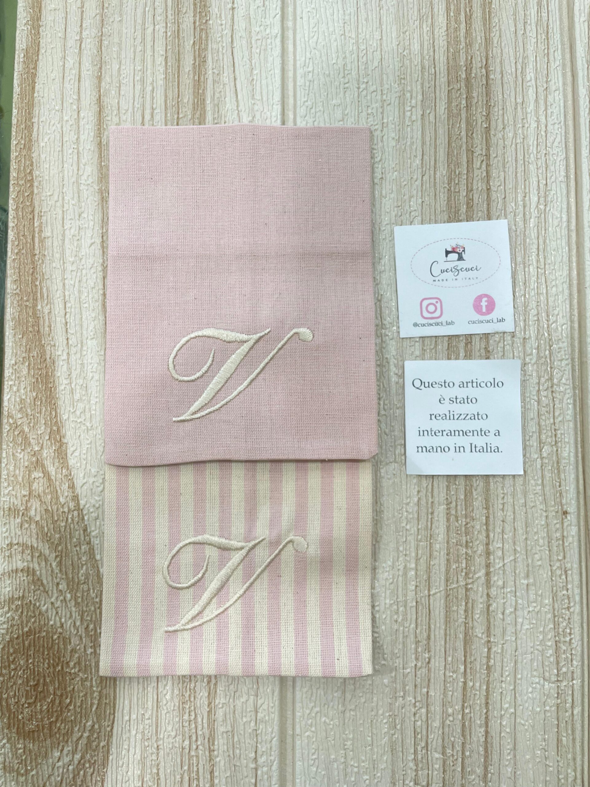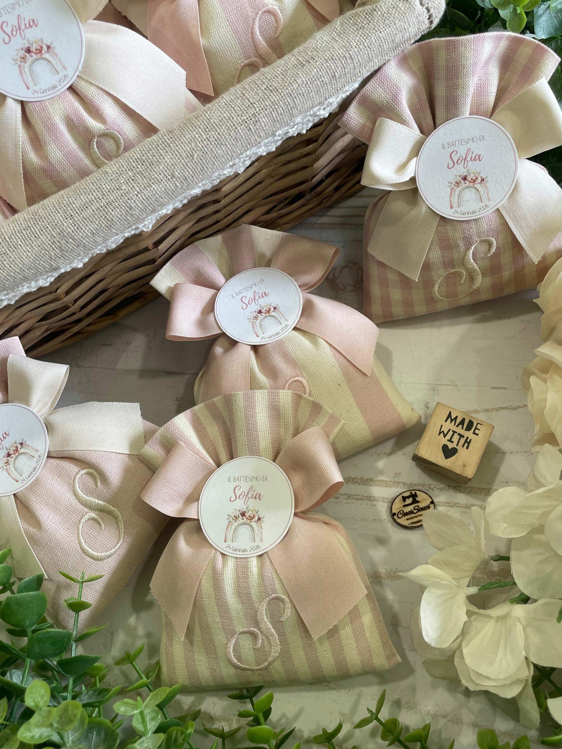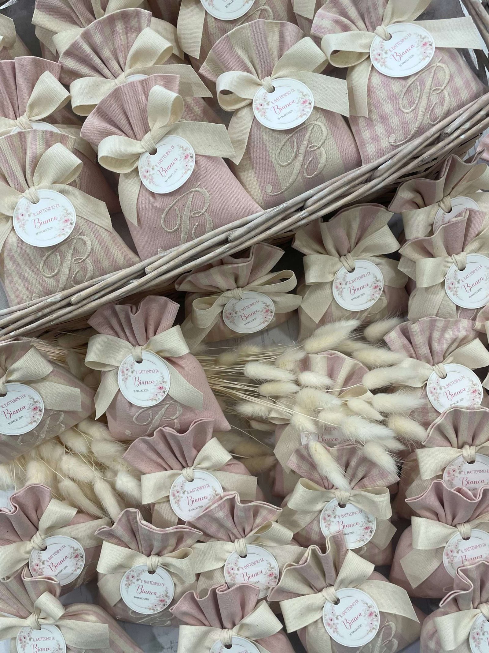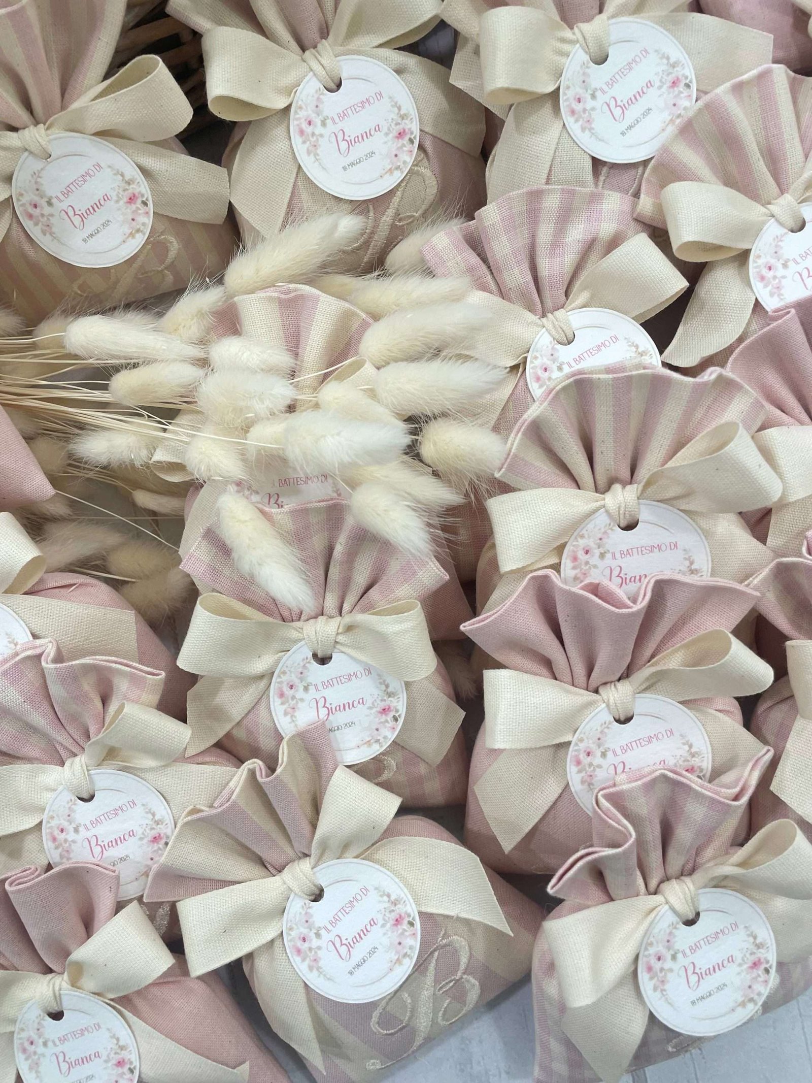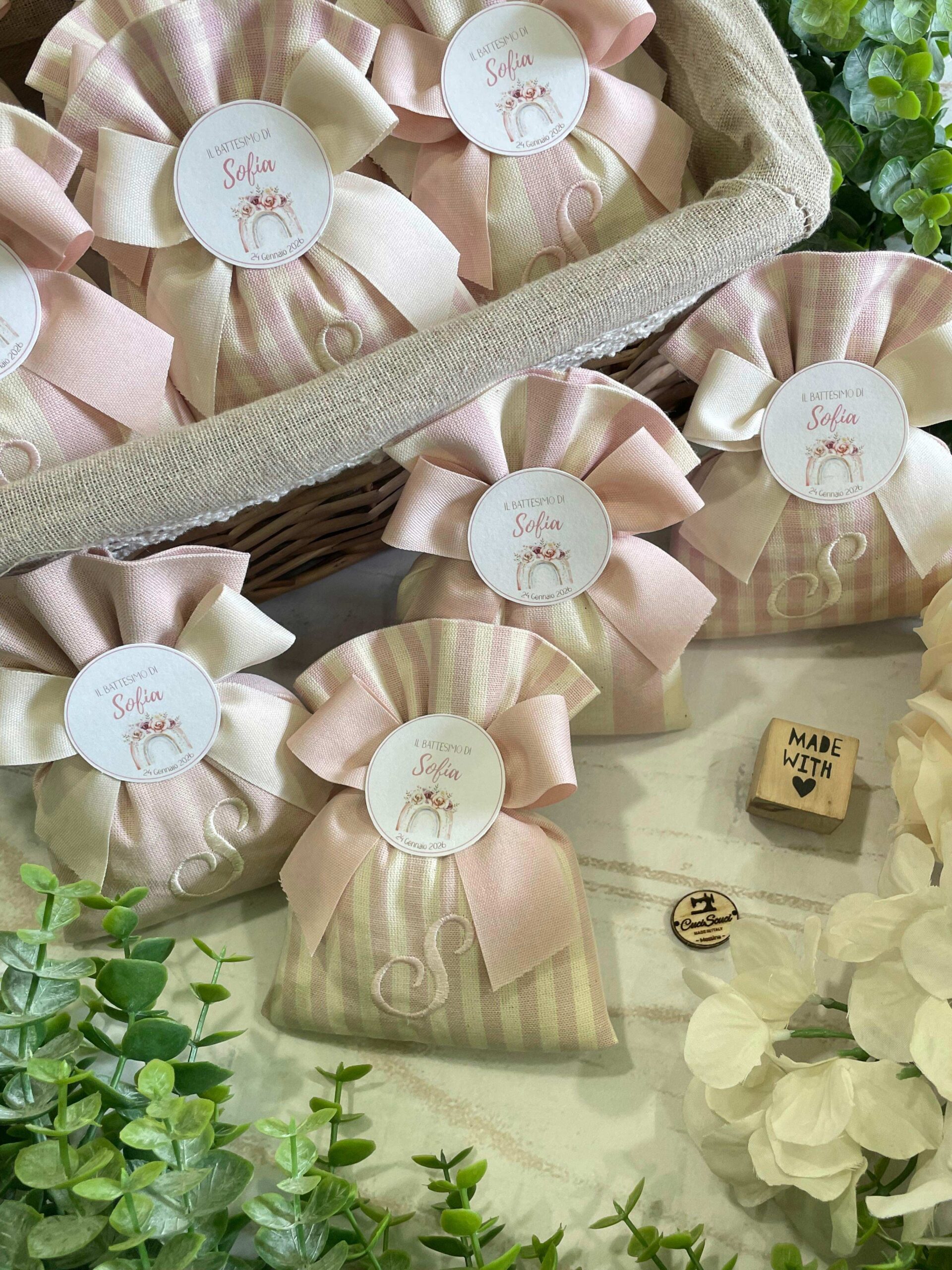 Il sacchetto, confezionato in pregiato cotone tinto filo nei delicati toni del rosa cipria, è disponibile in fantasie assortite (o su richiesta) e impreziosito dal ricamo di un’iniziale, per un tocco personale e raffinato.