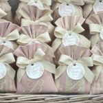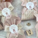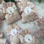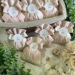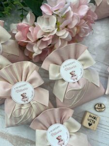 • Confezionato: bomboniera pronta da donare, completa di ricamo, fiocco coordinato e 5 confetti in busta sigillata.